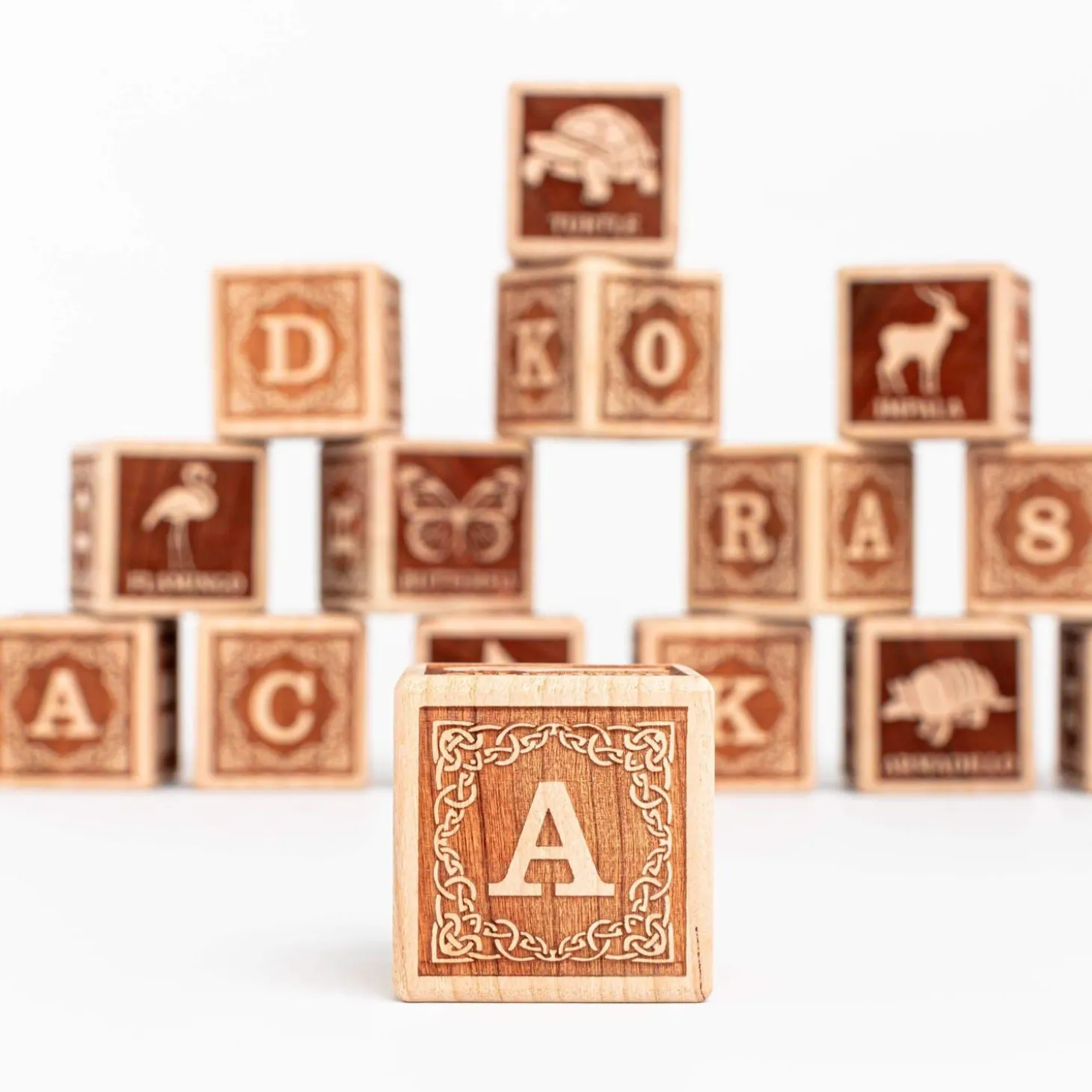 This gorgeous set of Animal Alphabet Blocksare made of solid Canadian Cherry Hardwood and permanently engraved on ALL SIX sideswith uppercase letters, numbers and two animal graphics with English animal names per block.