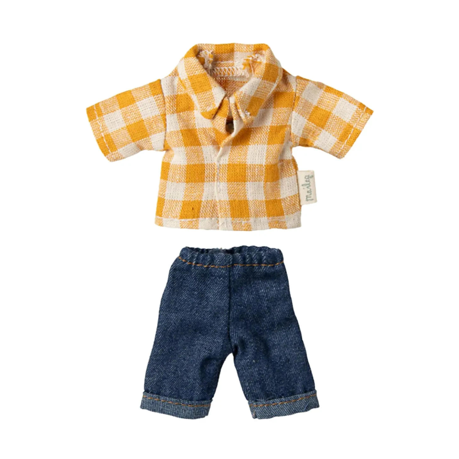 A classic Maileg item; Dad mouse in checked shirt and denim pants. This mouse fits furniture and accessories in size mouse. Buy more clothes separately. Clothes in size mum/dad fits this mouse.