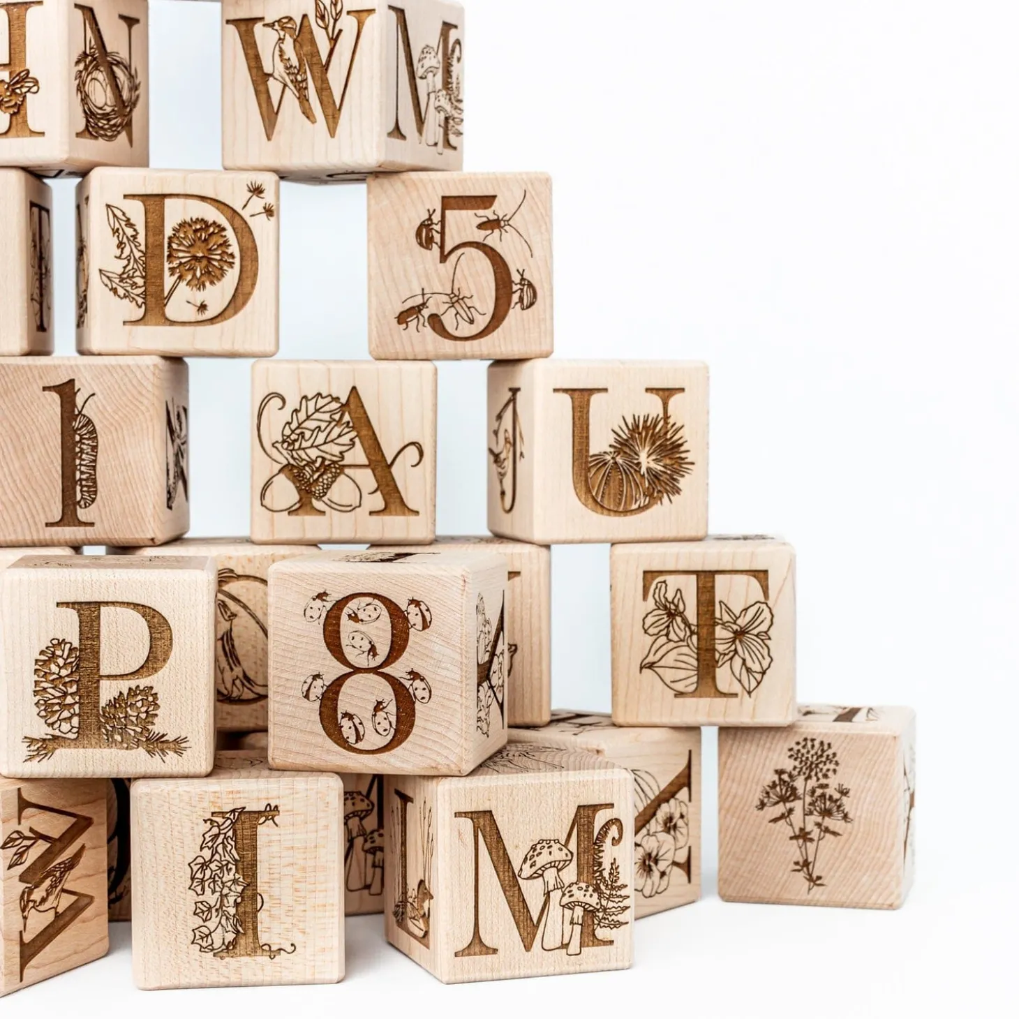 Say HELLO to our Nature Collection Alphabet Blocks – made exclusively for The Playful Peacock. Made of solid sustainably sourced Canadian Maple, all blocks are permanently engraved onall SIX sides withuppercase letters, numbers and intricate North American nature-themed graphics.