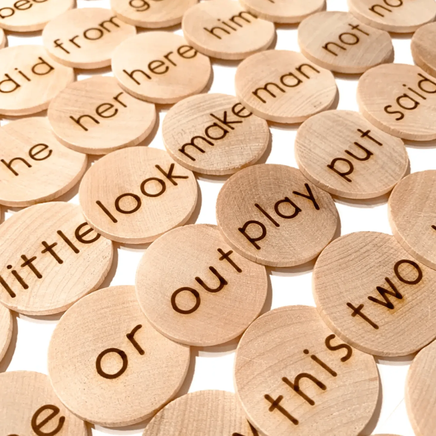 Our Grade one sight word learning discs are the perfect hands-on educational tool to build literacy skills and help children learn how to read. Easy to throw in your bag and built to last, these wooden flashcards are the perfect addition to your Montessori or Reggio classroom, or your homeschool learning curriculum. Your child will love learning these first sight words, and have fun practicing spelling the words and creating simple sentences with these tactile wooden discs with easy-to-read letters.