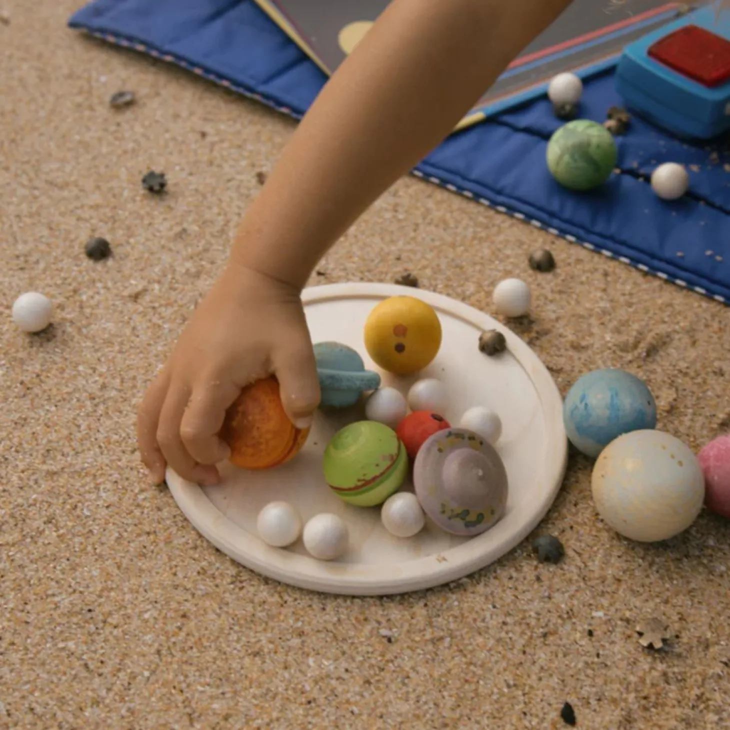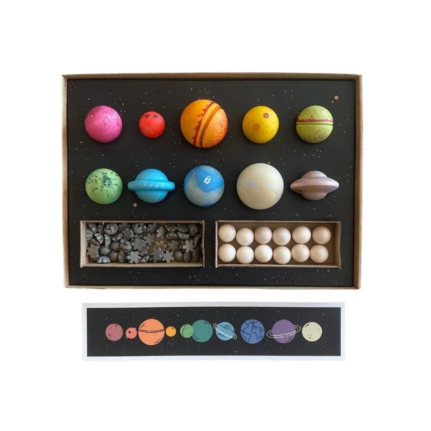 Embark on a celestial journey with Grapat’s “Dear Universe” collection, a treasure trove of handcrafted wooden planets designed to inspire the imagination of young explorers. This iconic set by the renowned European toy maker, Grapat, invites children to delve into the mysteries of outer space through play. With over 40 beautifully crafted pieces, ranging from 12mm to 45mm, each element is painted in vibrant hues and varying sizes, capturing the essence of the cosmos.