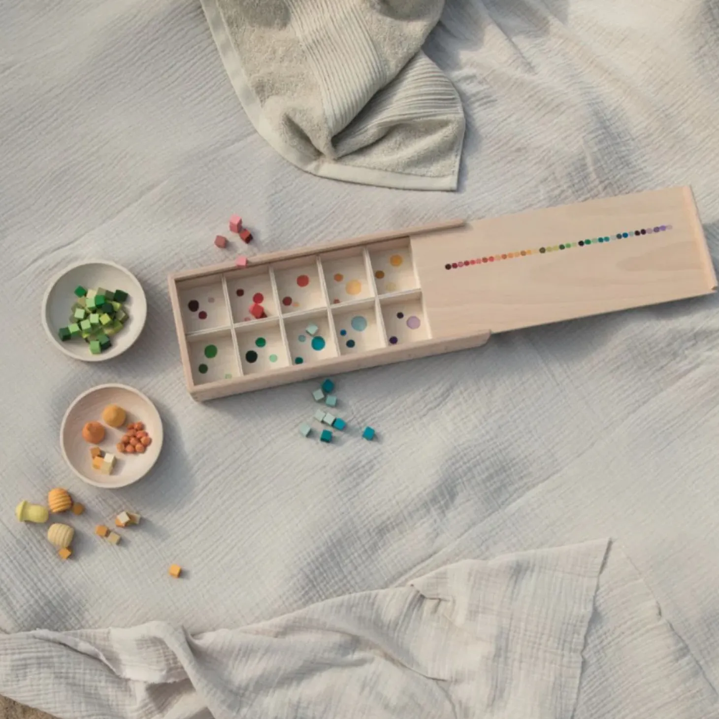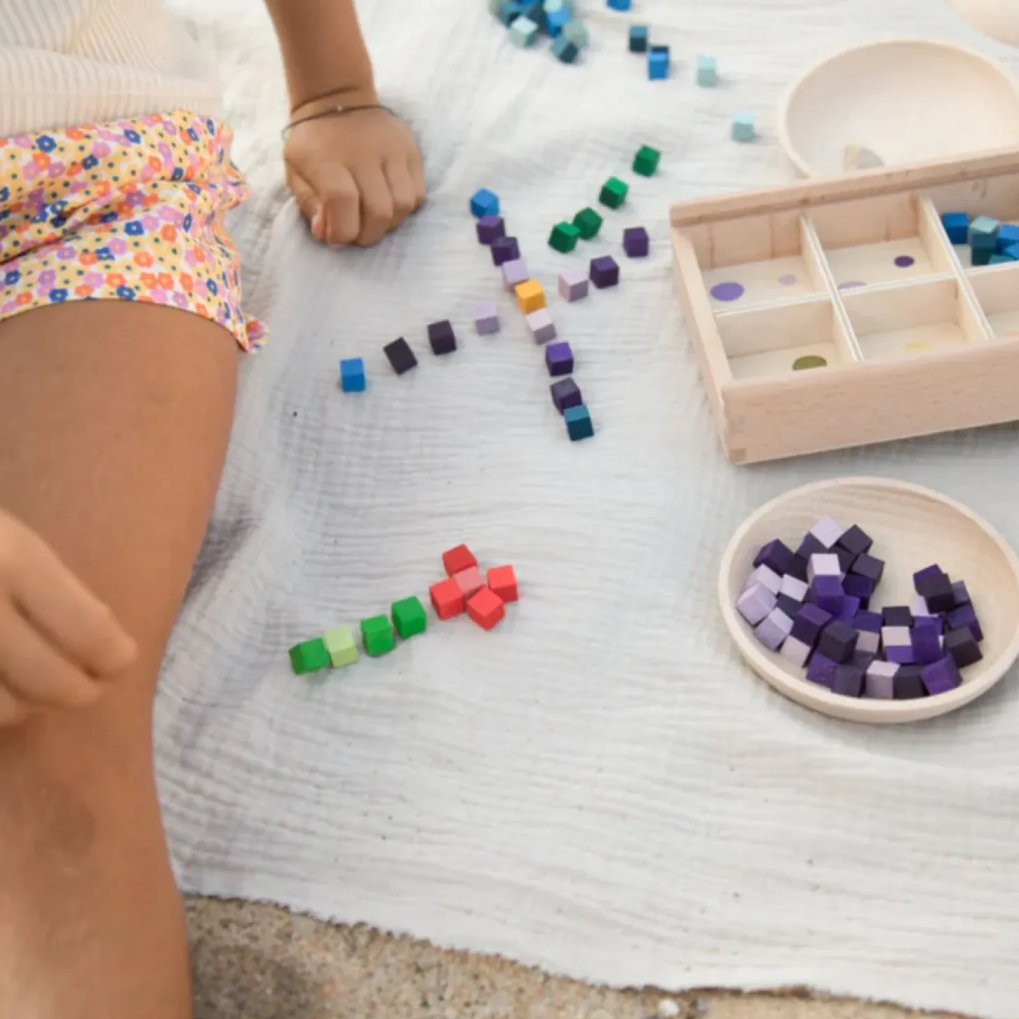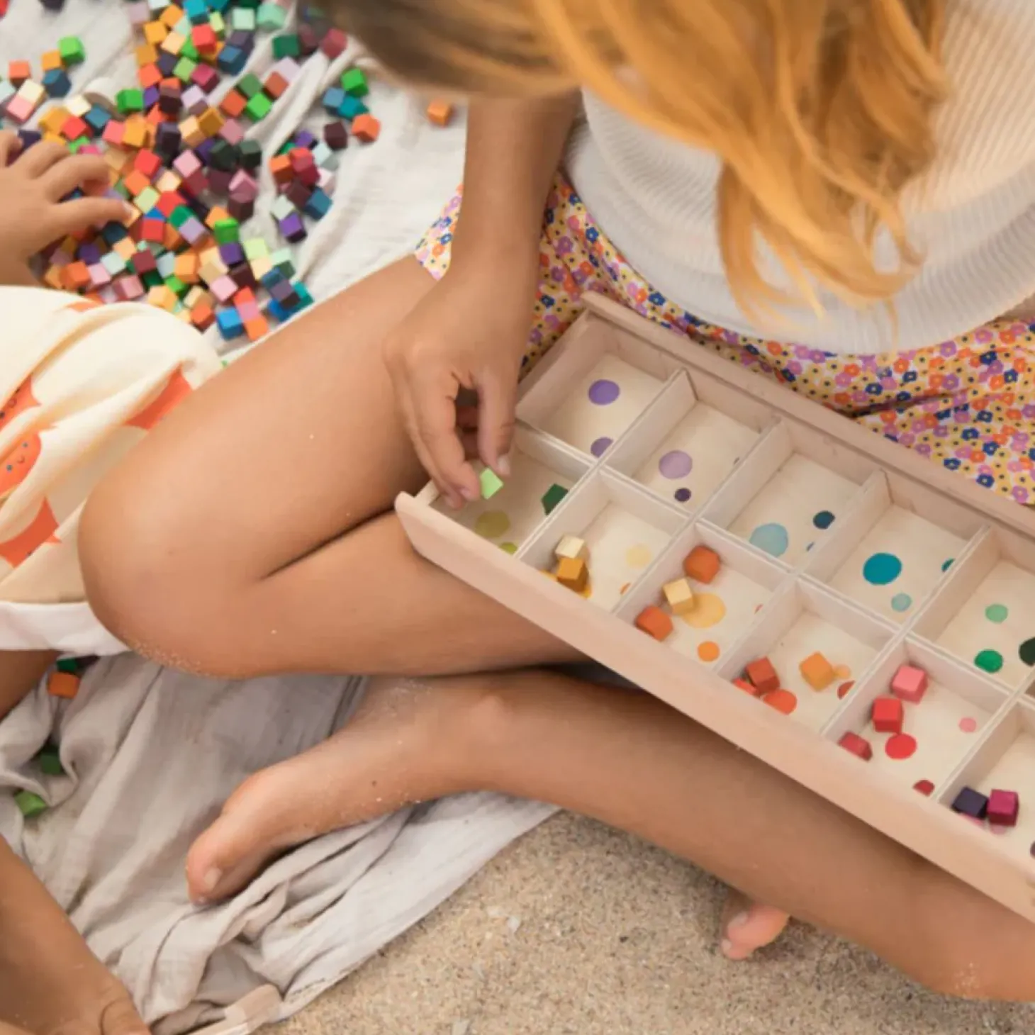 Dive into the world of colour and creativity with Grapat’s “Mis and Match,” a captivating collection of colourful cubes designed to inspire young minds. This innovative set features over 400 wooden cubes in 36 radiant gradient colors, housed in a beautifully hand-painted sorting box. “Mis and Match” is the perfect canvas for children to exploremathematical, geometric, and artistic concepts, blending education with imagination.