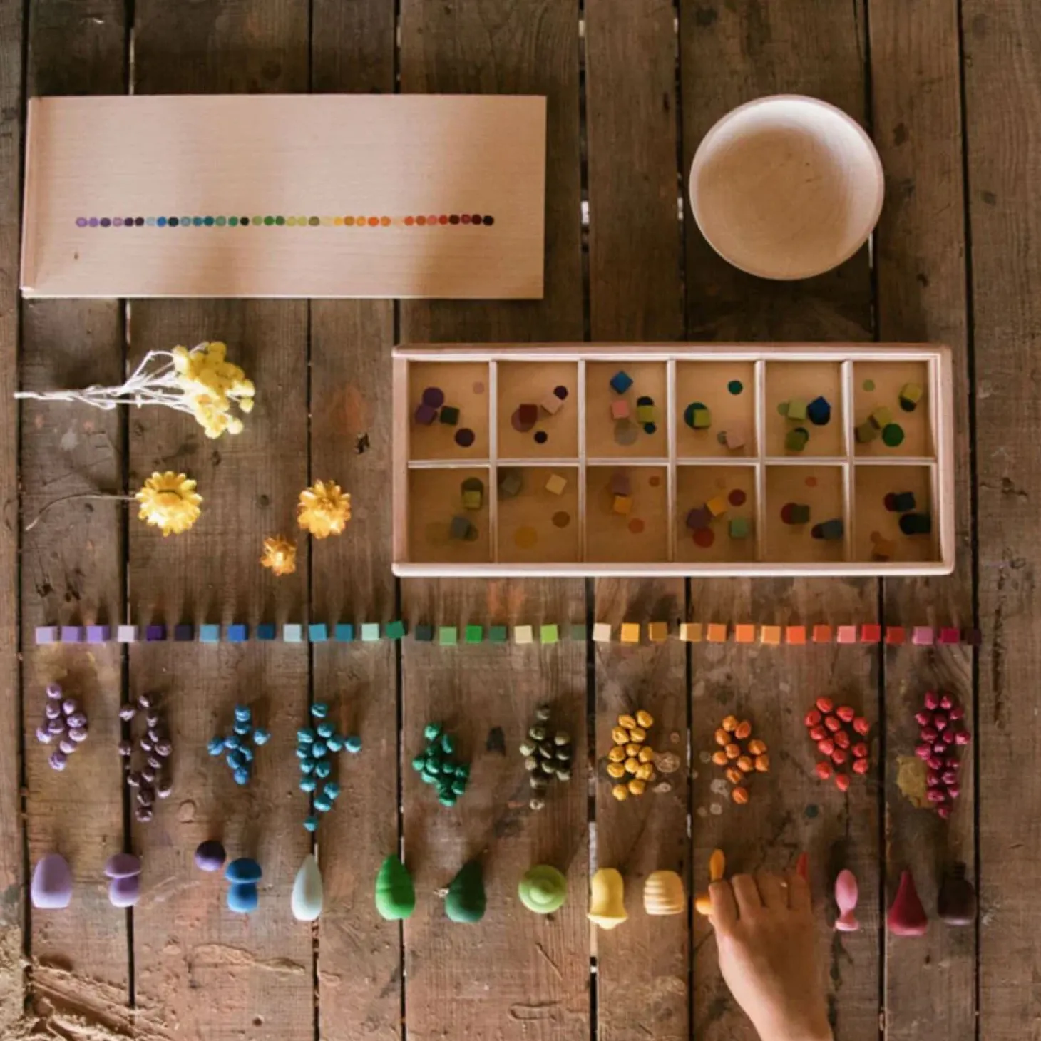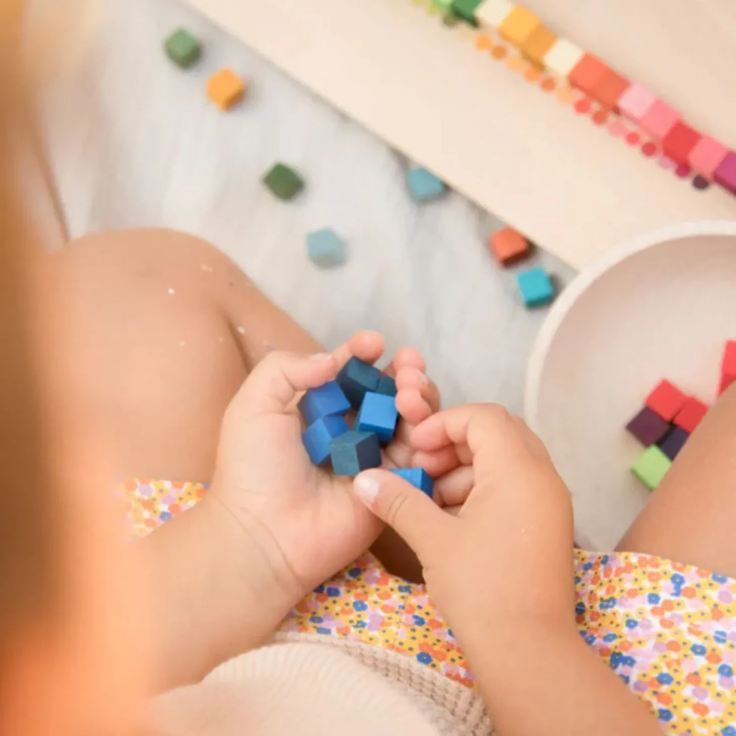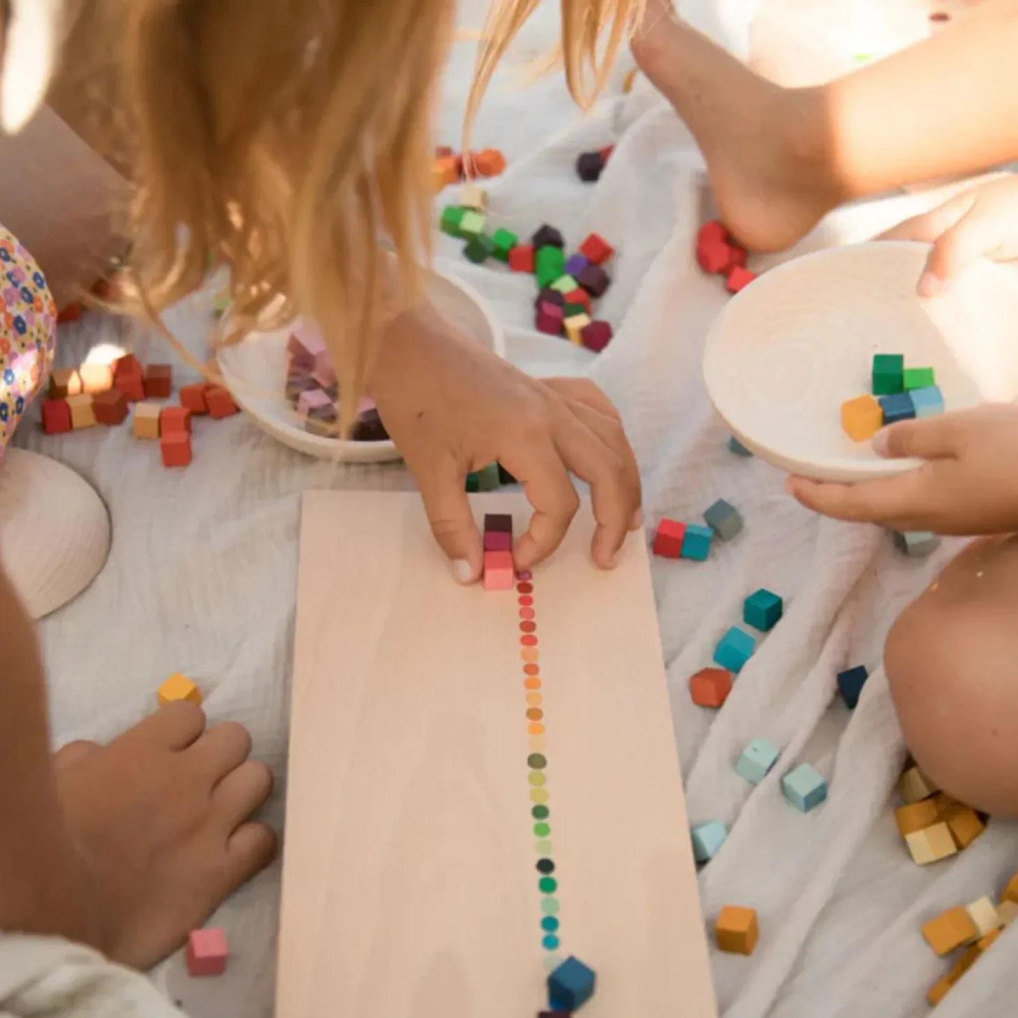 Dive into the world of colour and creativity with Grapat’s “Mis and Match,” a captivating collection of colourful cubes designed to inspire young minds. This innovative set features over 400 wooden cubes in 36 radiant gradient colors, housed in a beautifully hand-painted sorting box. “Mis and Match” is the perfect canvas for children to exploremathematical, geometric, and artistic concepts, blending education with imagination.