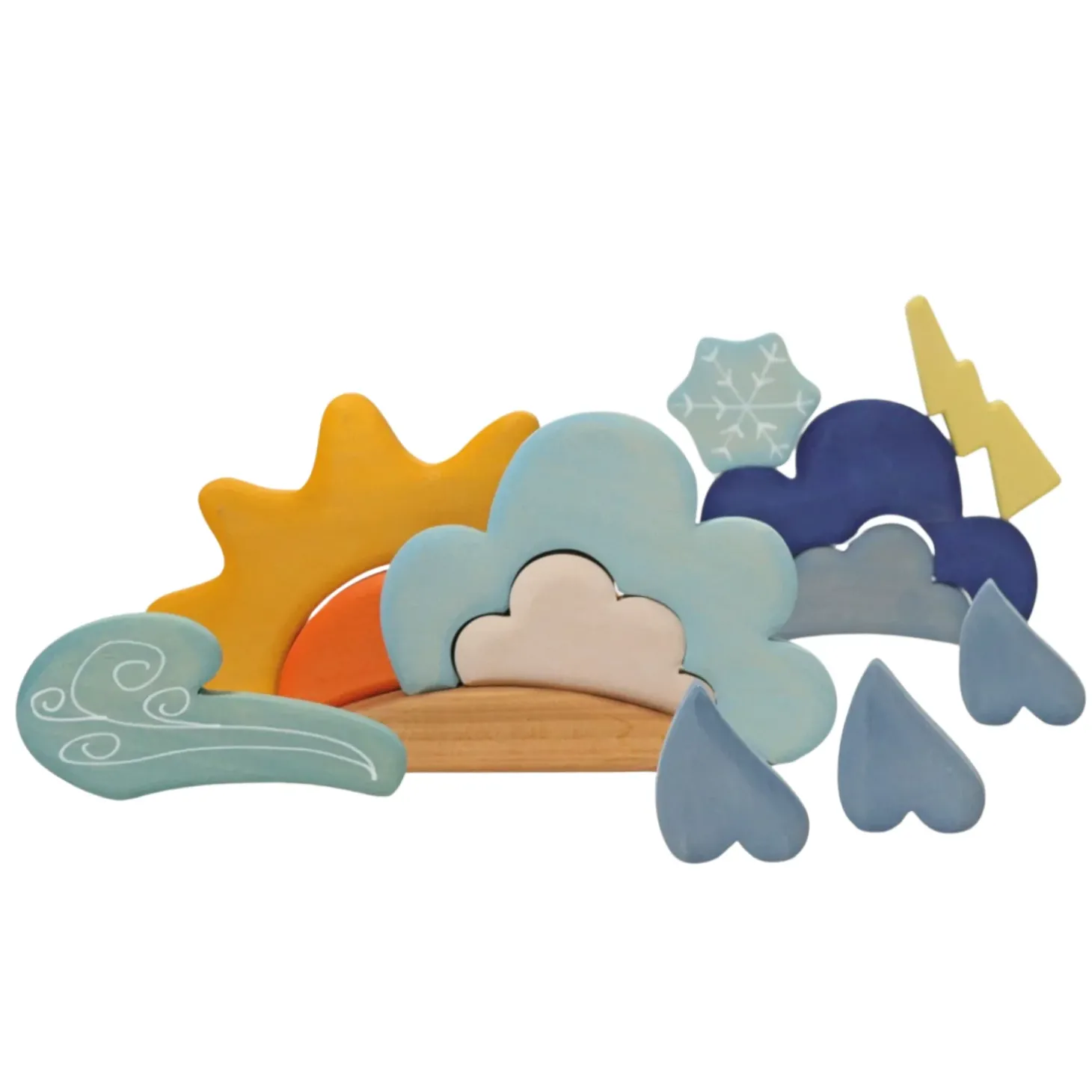 • Set includes 13 pieces: 1 wind, 4 clouds, 1 horizon, 2 sun pieces, 1 snowflake, 1 lightning, and 3 raindrops