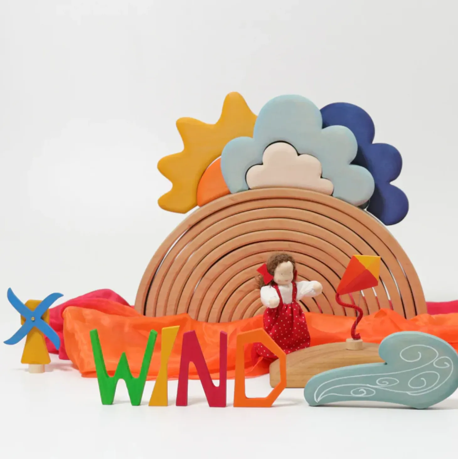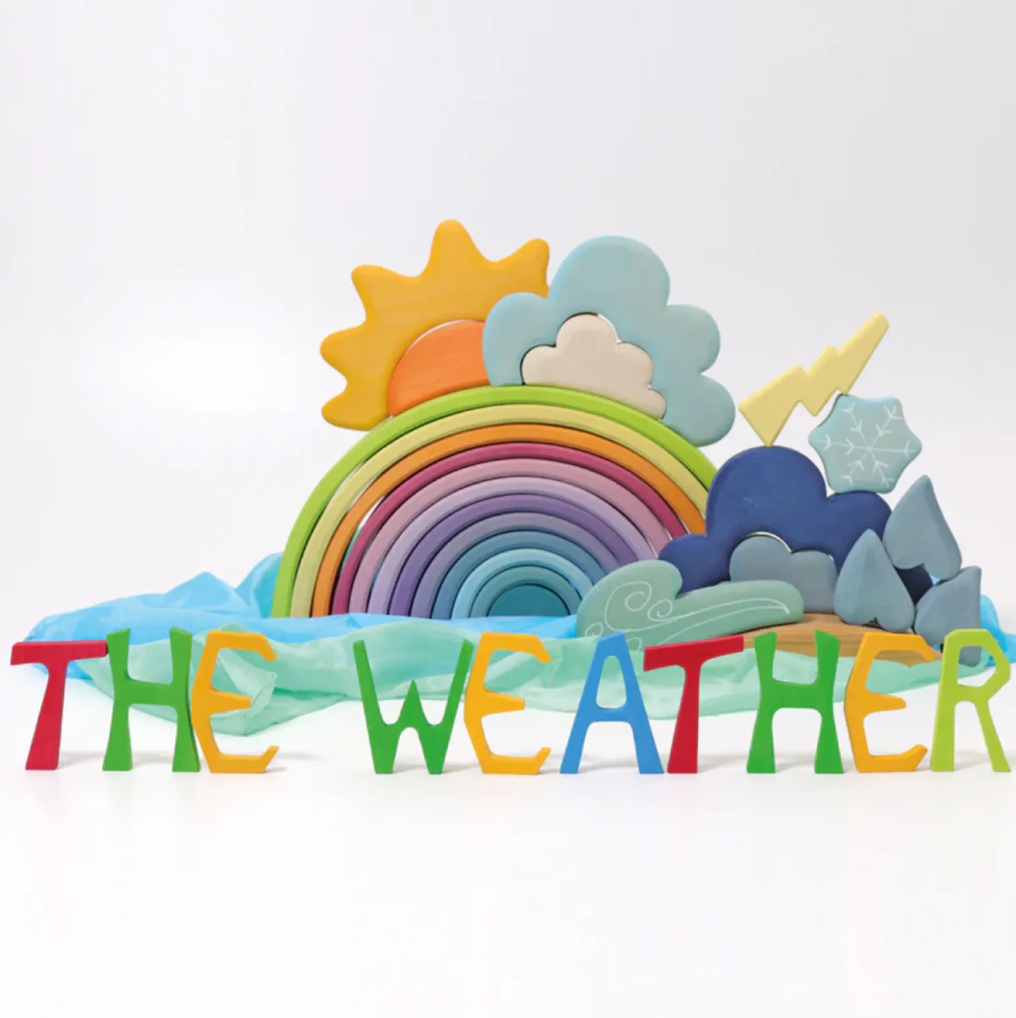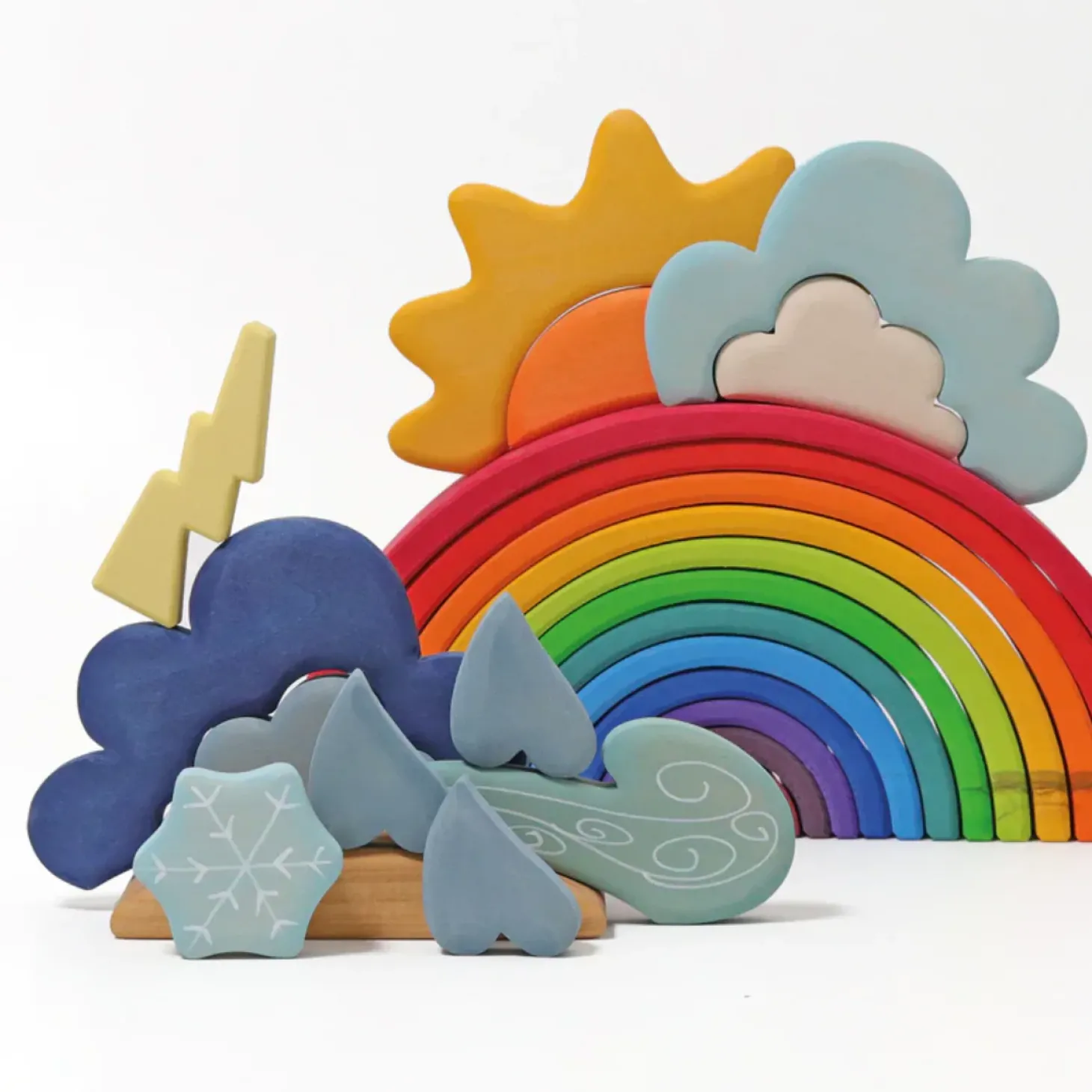 Discover the wonders of the sky with Grimm’s Wooden Building Weather Set, a captivating 13-piece toy that brings the magic of the weather into your child’s hands. This enchanting set, crafted by the celebrated European toy maker Grimm’s, is a delightful way for children to learn about and play with the elements of weather.