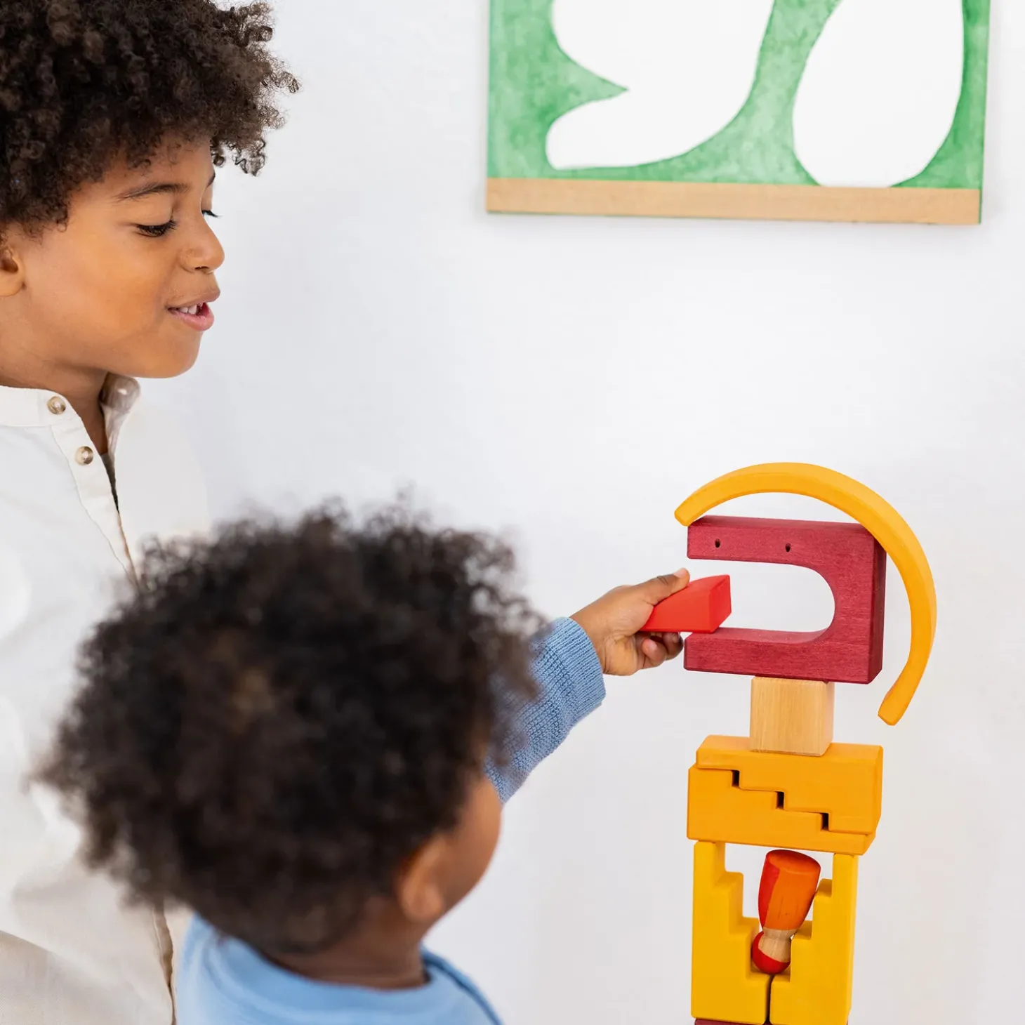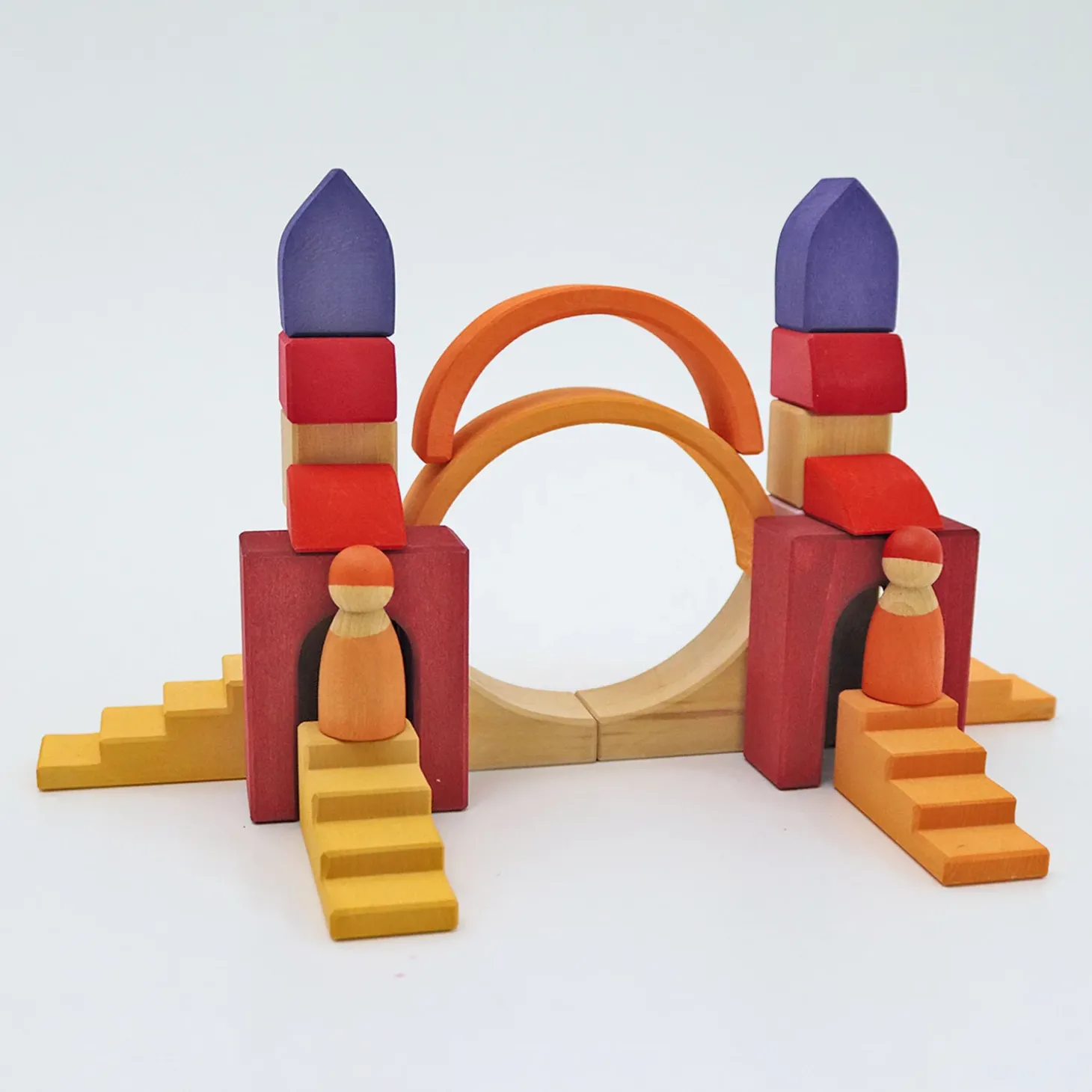 The Desert Sand set is a homage to the vibrant hues of a sun-drenched desert. Rich yellows, oranges, and reds blend seamlessly with natural wood, creating a warm, inviting landscape. The variety in shapes – from the special robes of the two included figures to the mountable, movable door – allows for endless possibilities in imaginative free building. This set is a perfect addition to the Grimm’s collection, encouraging children to mix, match, and create their own desert adventures.