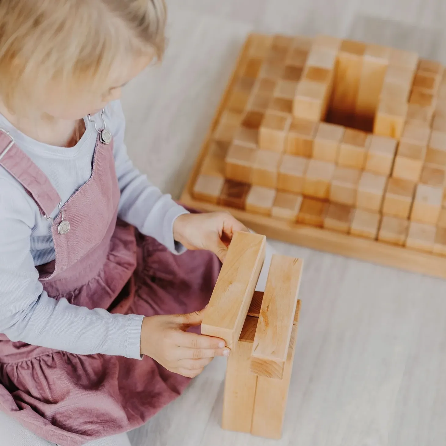• Set includes 100 natural building blocks in a wooden frame
