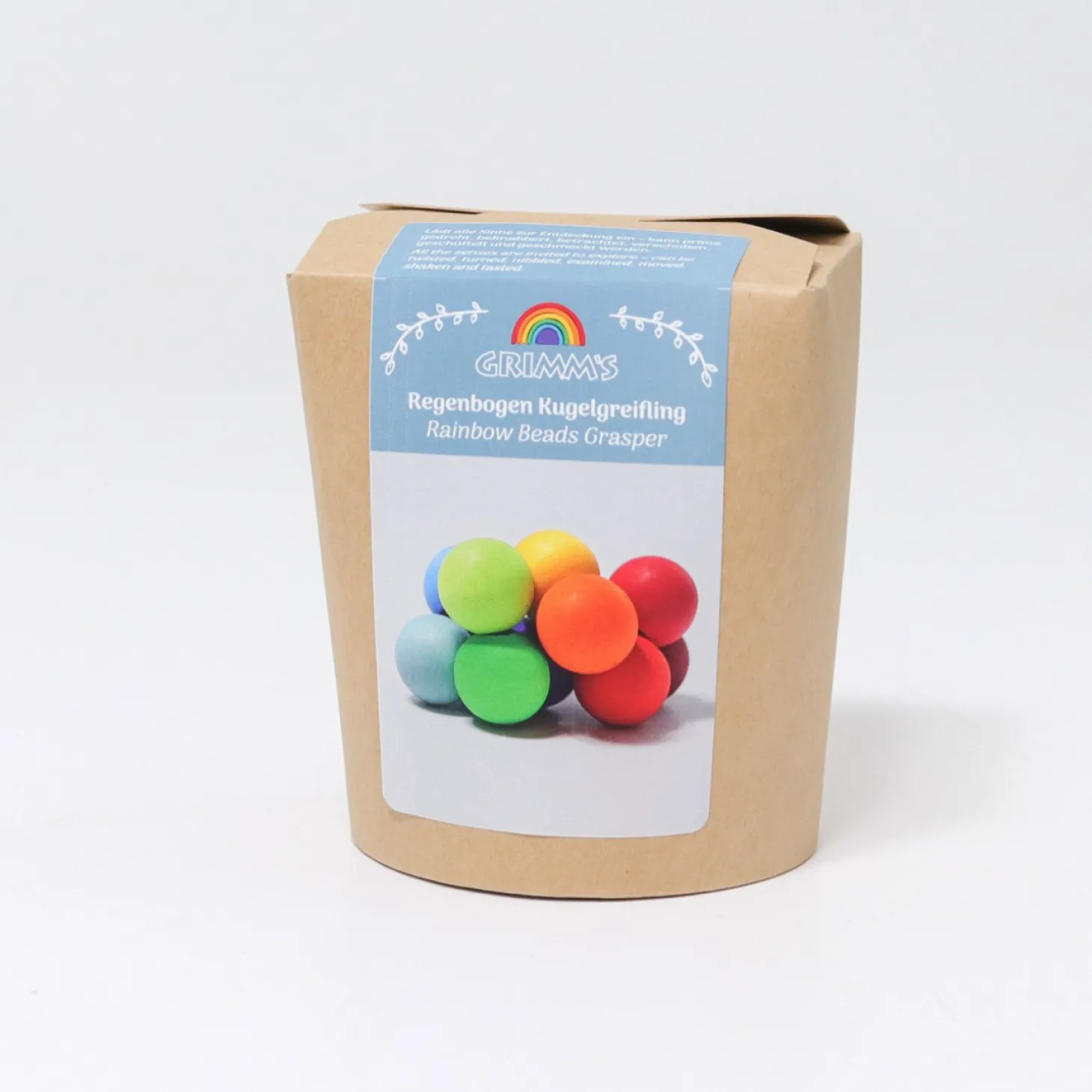 Introducing the Rainbow Beads Grasper by Grimm’s, the perfect “baby’s first wooden toy” designed to delight and stimulate babies aged 3 to 10 months. This enchanting toy is so much more than it appears, captivating young minds with its vibrant, natural rainbow colours, engaging shape, and delightful texture. As your baby grasps and manipulates the beads, they’ll squeal with delight at the pleasant rattling sound the wooden beads make when shaken.