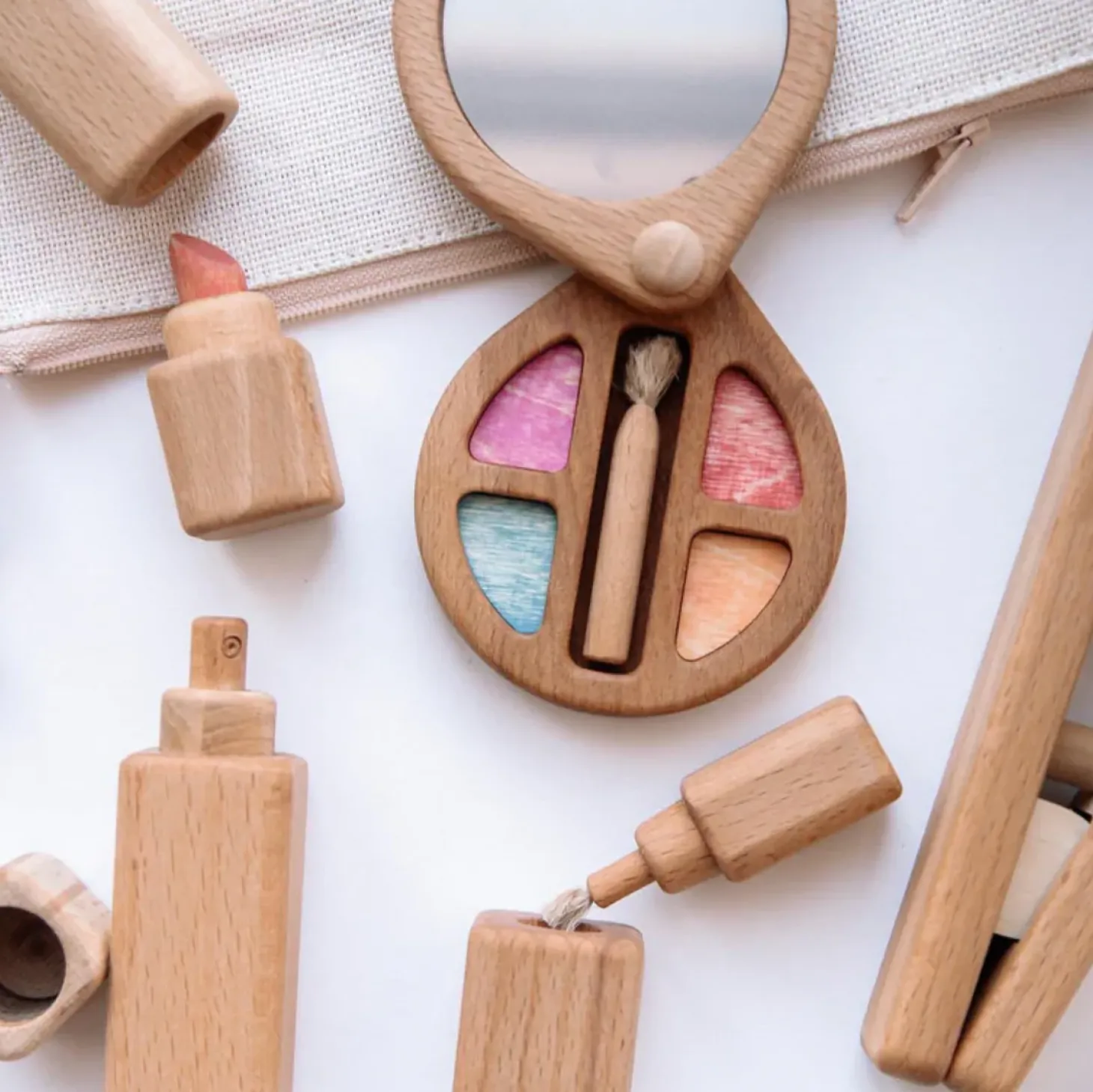 Dive into the world of glamour and creativity with the Wooden Beauty Set from Poltora Stolyara, perfect for any aspiring beautician or playful child ready to explore the art of makeup and styling. This meticulously handcrafted 8-piece set includes a compact eye palette & brush, mascara, nail polish with a removable cap and brush, lipstick with a removable cap, perfume with a removable cap, a hair brush, and a straightening iron, all neatly contained in a stylish pouch.