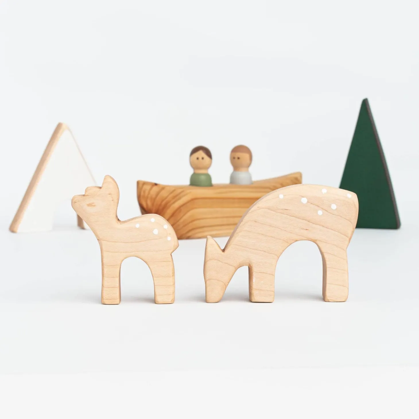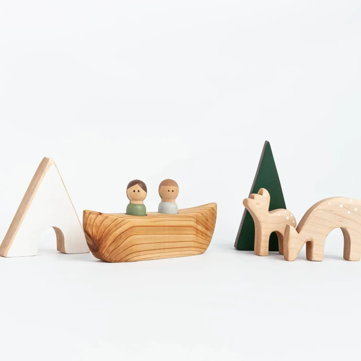 This beautiful 7-piece handmade wooden camping set is a great addition to summertime play! The set includes a canoe, two peg people, two deer, a tent and a tree. A fabulous play set to bringyour child’s imagination to life!