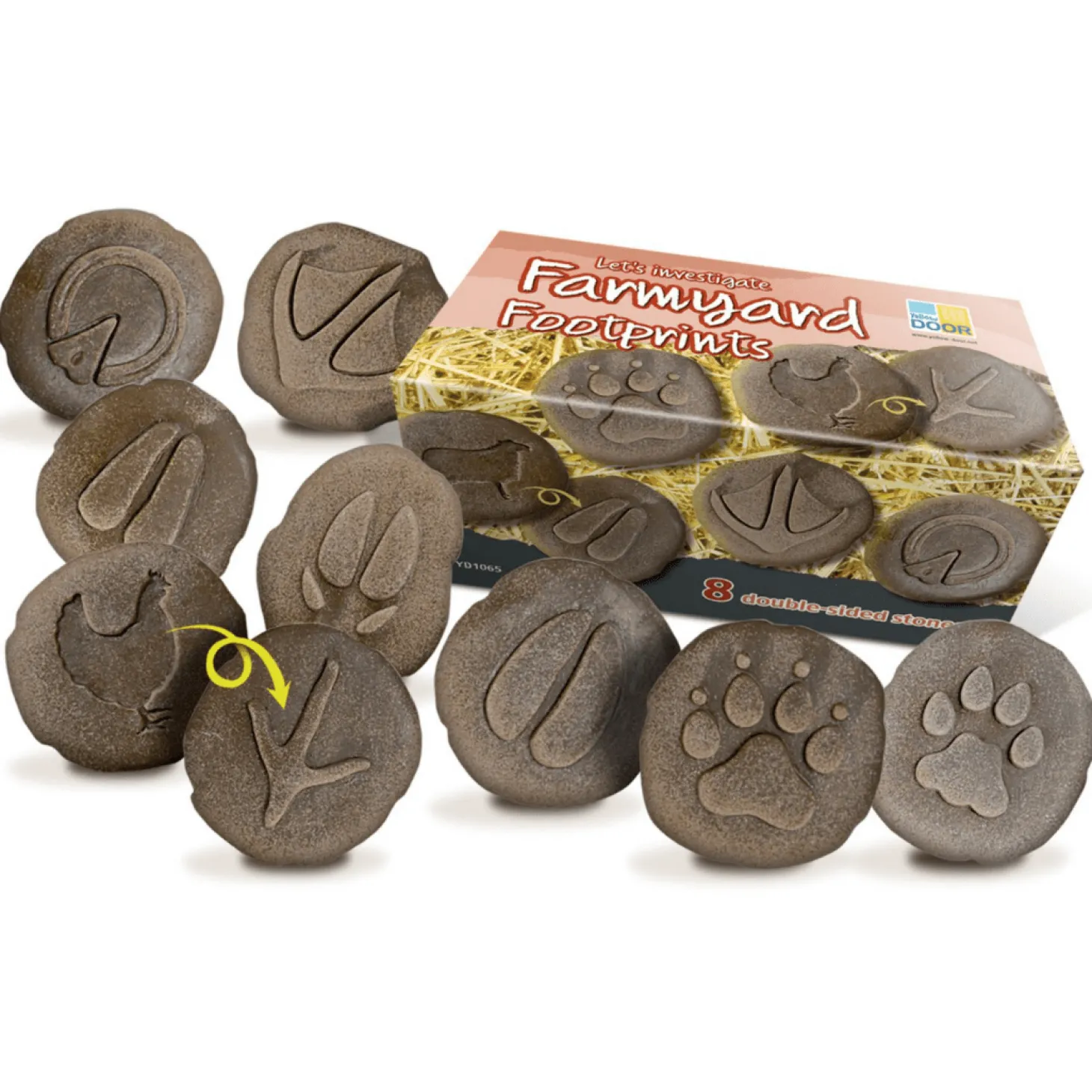 Each double-sided stone has the raised footprint of an animal on one side and an image of the animal indented on the other. Press the footprint into sand, mud or soil and create a trail for children to follow. What animal might they find at the end: cow, horse, sheep, pig, dog, cat, chicken or duck? They can record their findings by taking rubbings and making impressions in play dough. When the work is done, the children can give the footprints a good clean with soap and water, before a new farmyard adventure tomorrow.