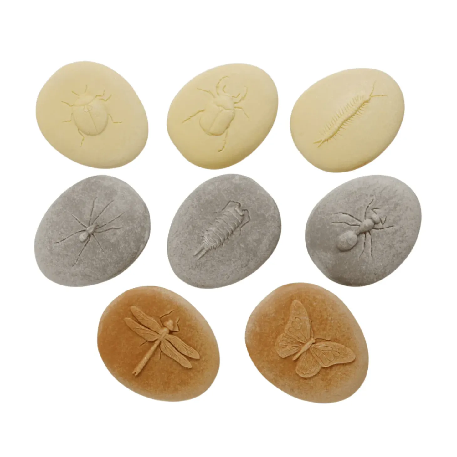 • Each set contains eight stones: ant, beetle, butterfly, centipede, dragonfly, ladybug, spider, and woodlouse,