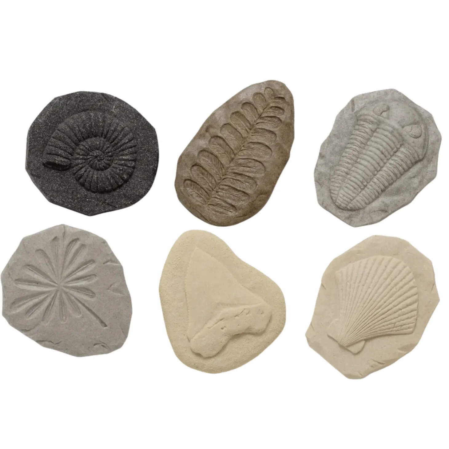 • Each set contains eight stones of: ammonite, clamshell, fern leaf, preserved leaves, sea urchin, shark’s tooth, shrimp and trilobite