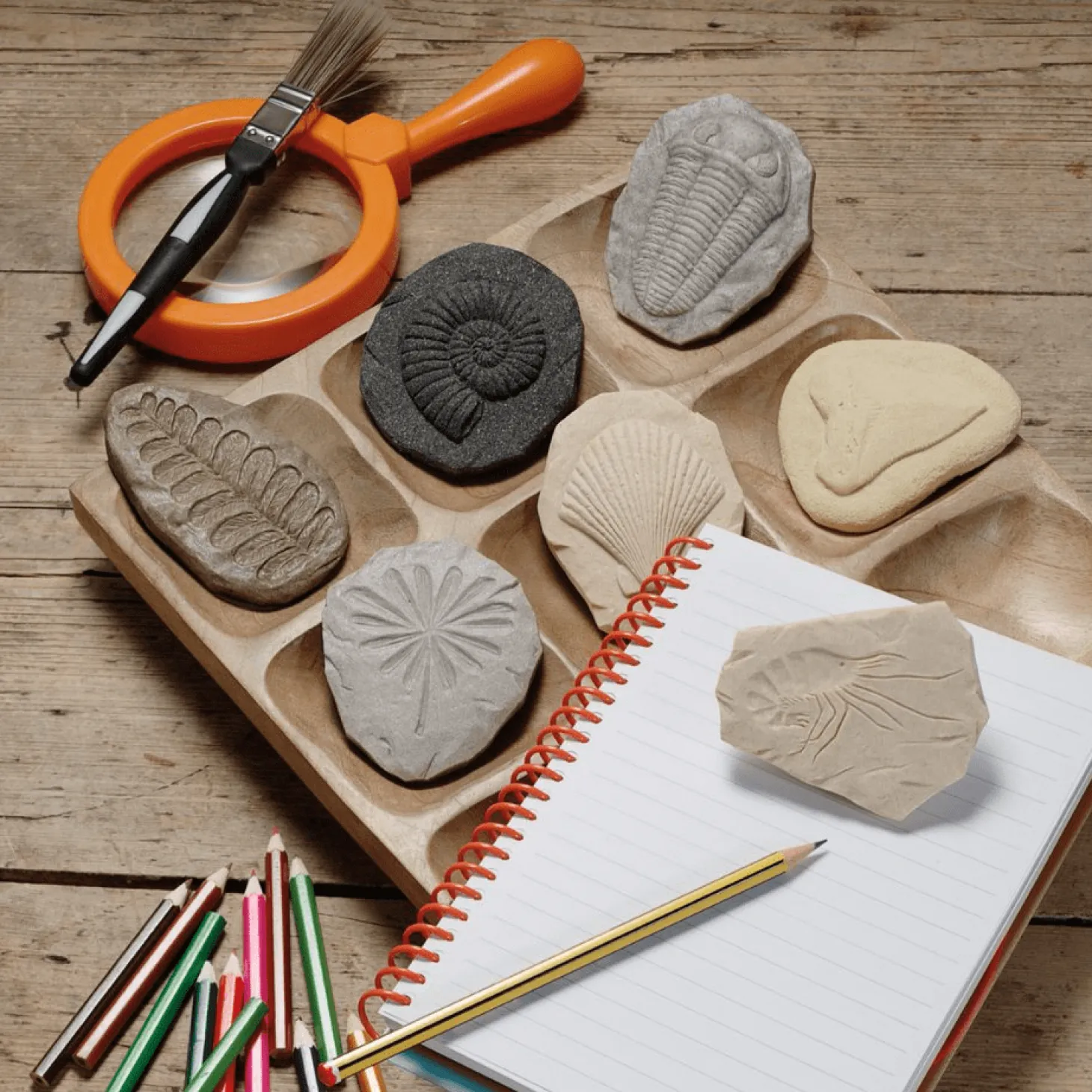 Fossils inspire children’s imaginations and excite young learners. They will delight in discovering and examining this set of eight realistic and tactile specimens including ammonite, clamshell, fern leaf, preserved leaves, sea urchin, shark’s tooth, shrimp and trilobite. Made from a unique stone mix, they are robust enough to be used outdoors.