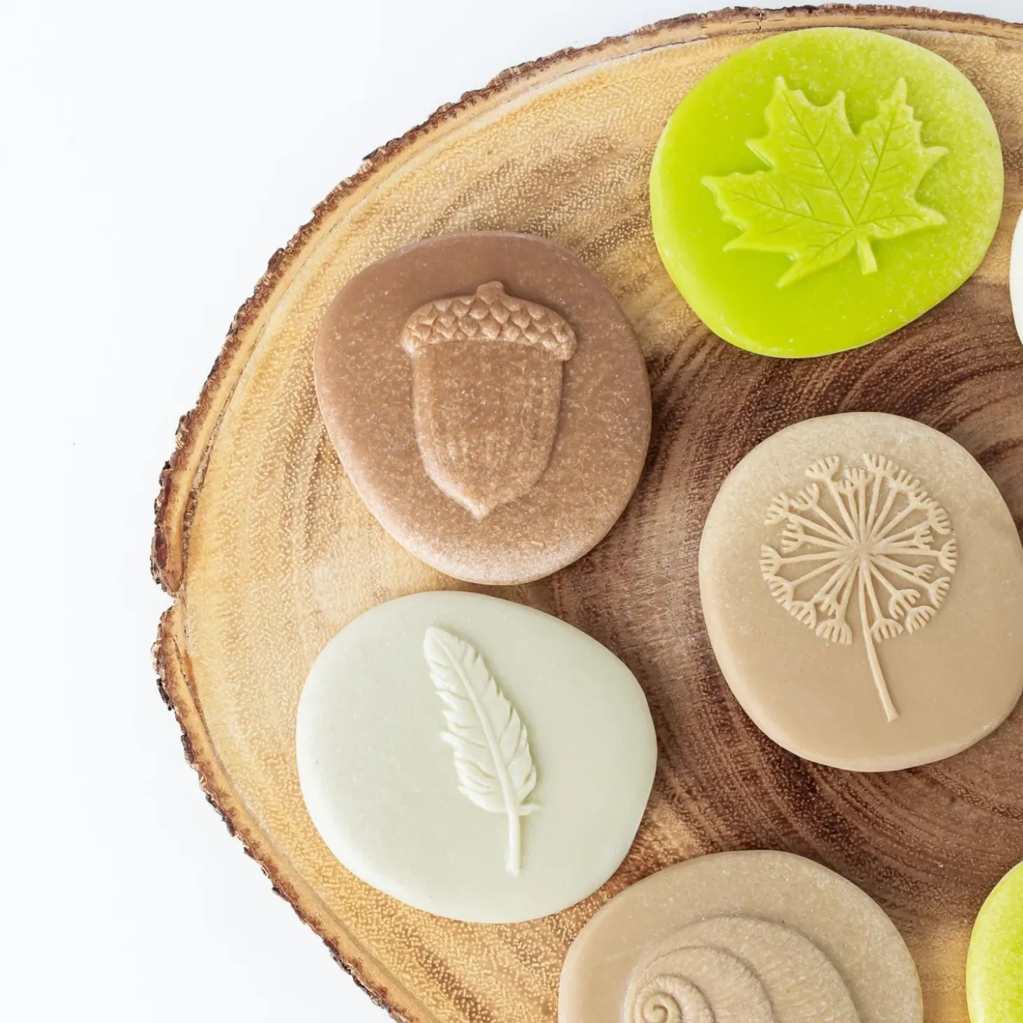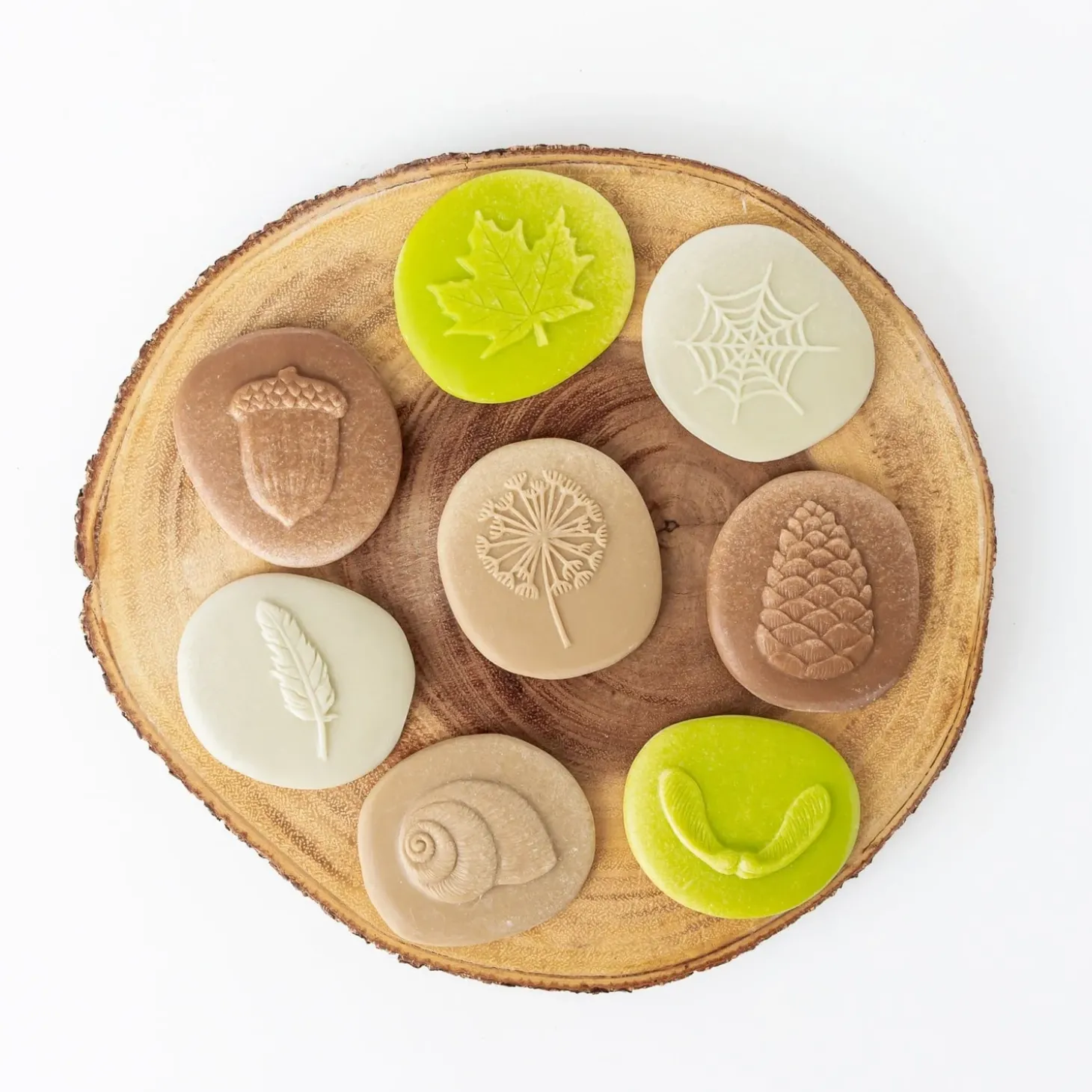 • Each set contains eight stones: acorn, dandelion seedhead, feather, maple leaf, maple seeds, pine cone, snail shell, and spider’s web.