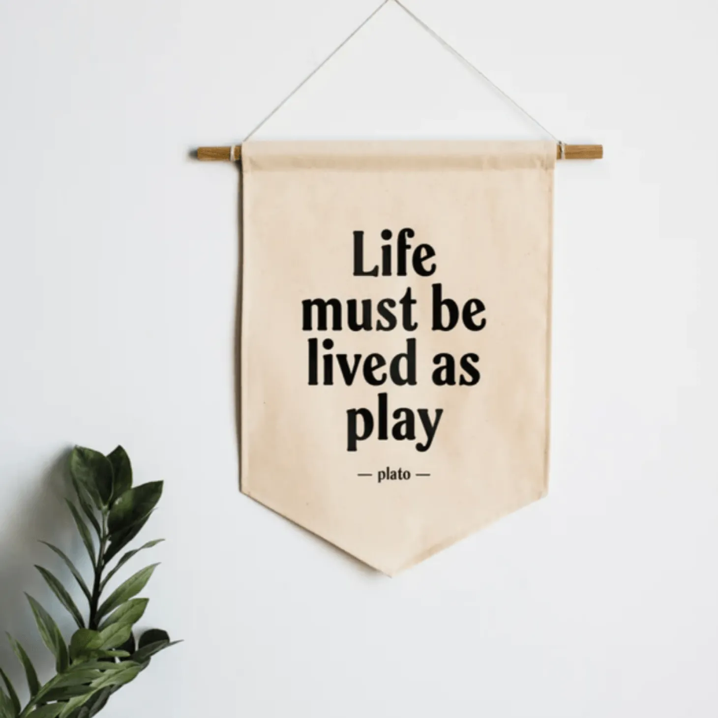 • Banner is printed with the following text: “Life Must Be Lived As Play” – Plato