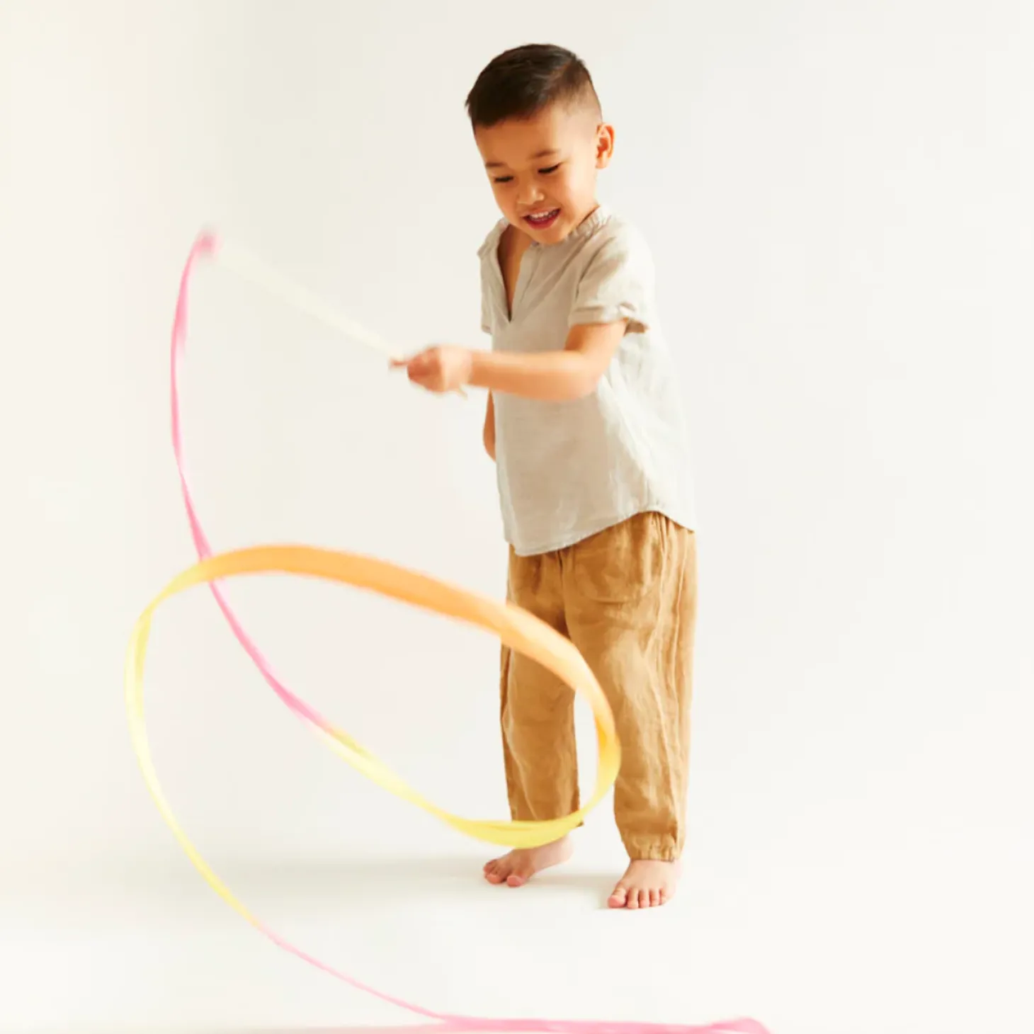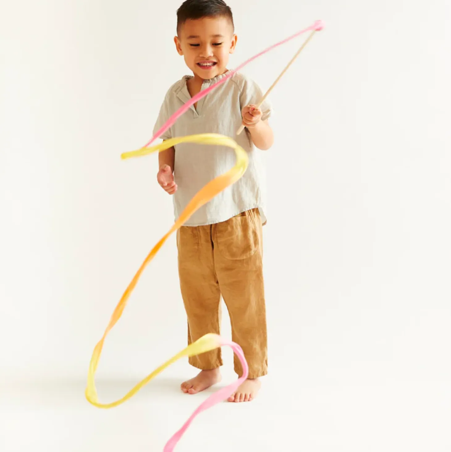 Each streamer is topped with a decorative wooden bead, adding an extra element of beauty and craftsmanship. The sturdy wooden wand ensures durability and ease of handling, making it a perfect fit for young adventurers. Sarah’s Silks, known for their dedication to high-quality, 100% silk toys, ensures that this streamer is not only visually stunning but also safe and sustainable for endless play.