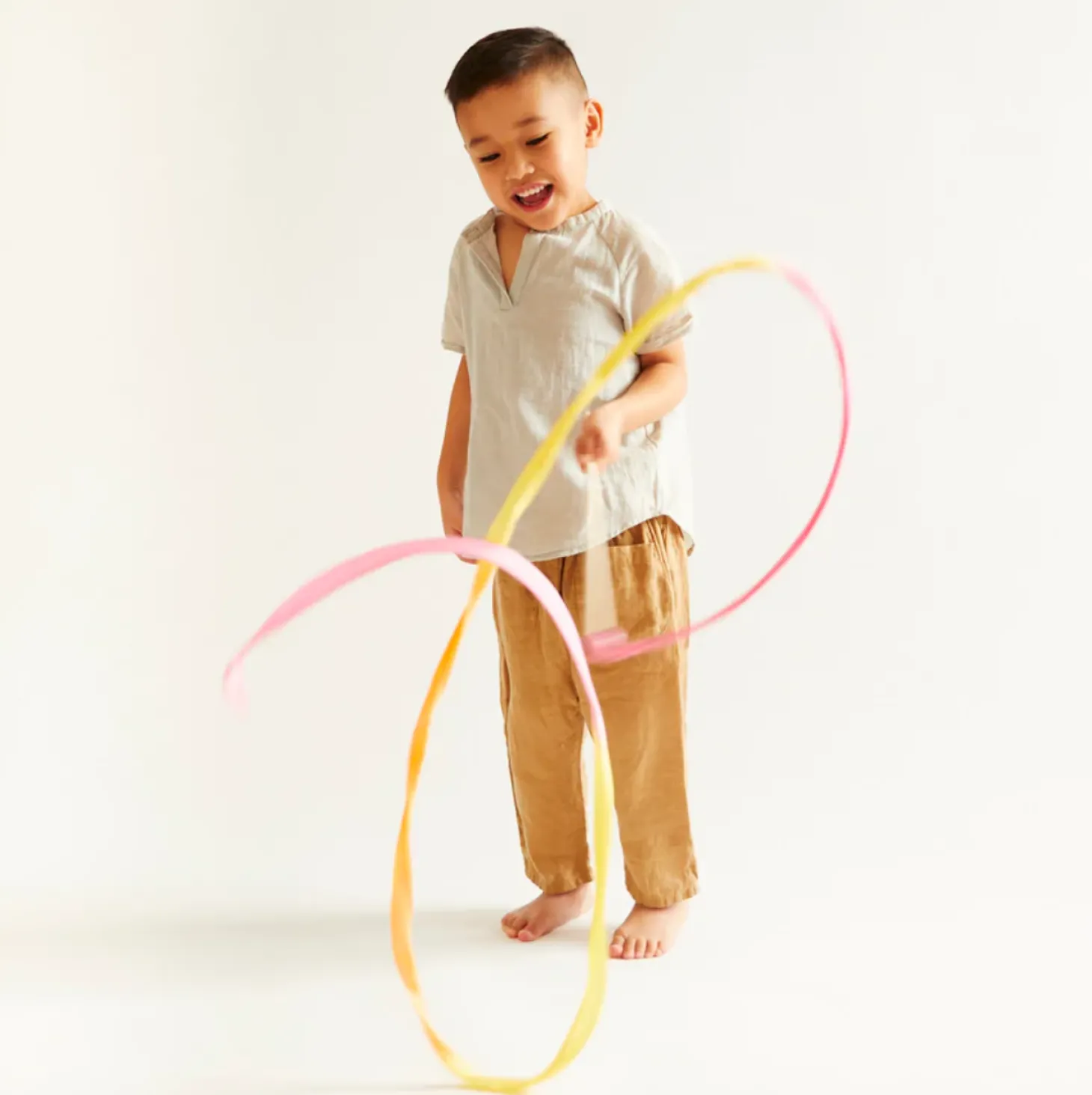 Discover the enchanting world of play with the Silk & Wooden Streamer in Hummingbird Pink, a limited edition marvel from Sarah’s Silks Easter & Spring Collection. This larger version or our best-selling mini streamer features an impressive 9 feet of shimmering silk attached to an 18-inch wooden wand, making it a grander companion for all sorts of imaginative adventures. The streamer, in its vibrant hummingbird pink hue, dances gracefully in the air, inviting children to engage in creative and active play. Whether they are writing letters in the sky, dancing to their own rhythm, pretending to fish in a make-believe pond, or simply waving it in the wind, this streamer adds a touch of magic to every movement.