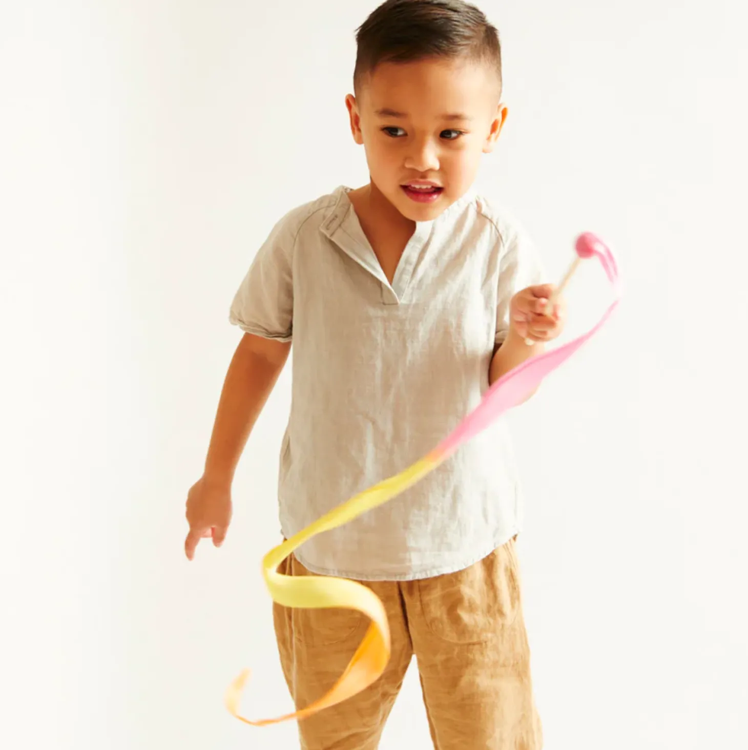 Introducing the Mini Silk & Wooden Streamer from Sarah’s Silks, now in the charming limited edition Hummingbird Pink colourway,a part of the exclusive Easter & Spring Collection. This delightful toy combines the natural beauty of a wooden wand with the grace of a shimmering silk streamer, crowned with a decorative wooden bead. It’s a perfect blend of simplicity and enchantment, inviting children to engage in a variety of playful activities. Whether it’s waving in the breeze, tracing letters in the air, pretend fishing, dancing around the garden, or creating a magical spell, this streamer sparks a multitude of imaginative play scenarios.