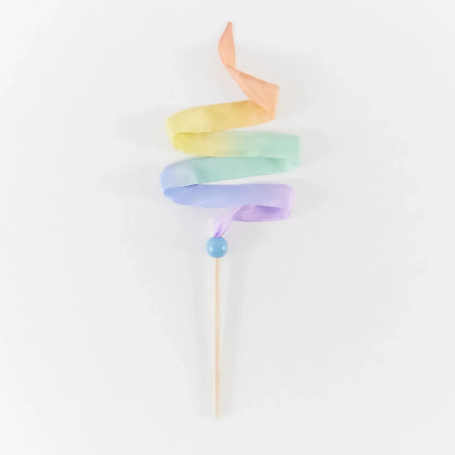 The Mini Soft Rainbow Streamer is an 8-inch, birch wood wand with a colorful, 3-foot long, 1-inch wide silk ribbon.