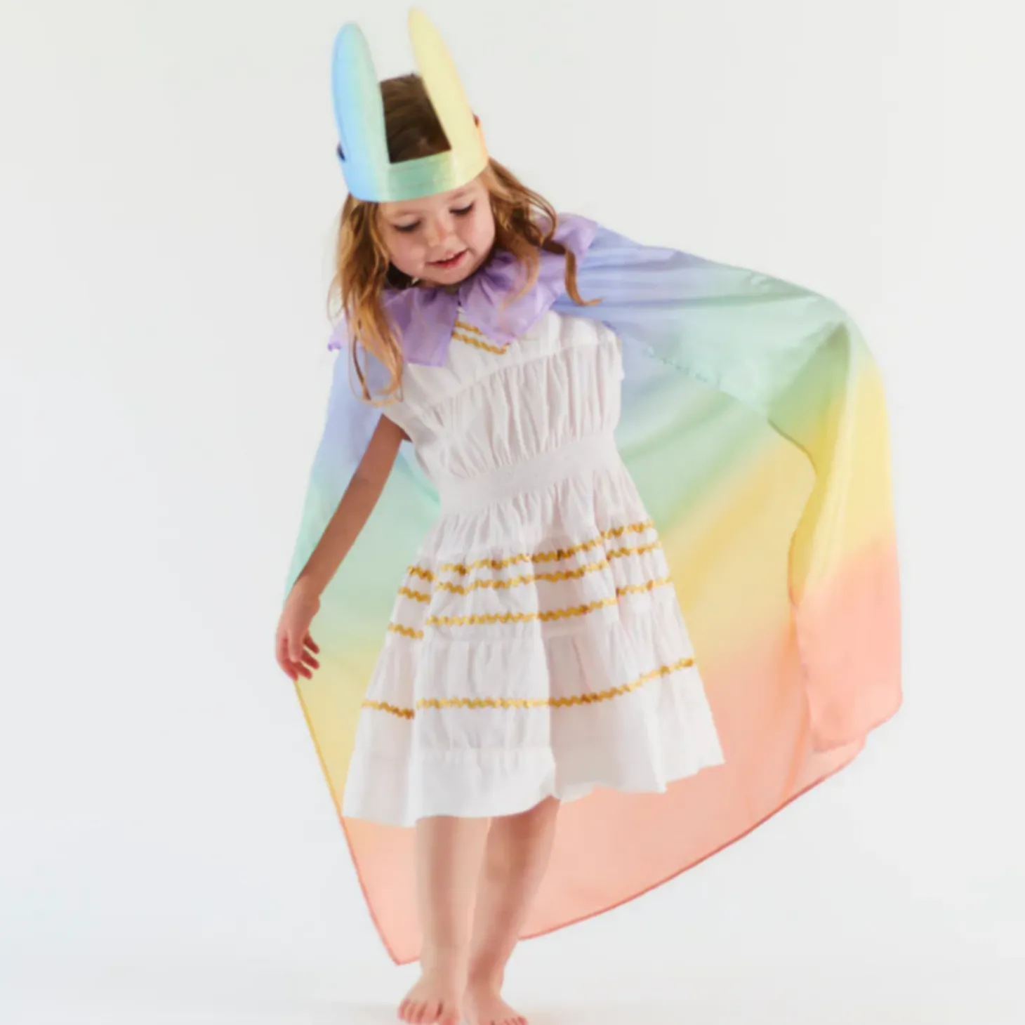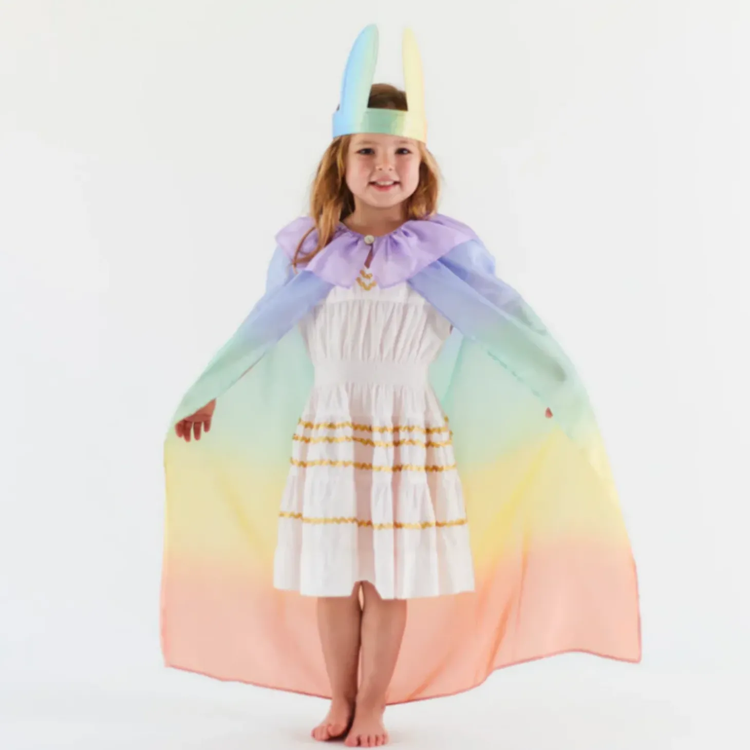 Silk Capes are 32-inches long with an elastic band that comfortably stretches from 18 to 28-inches. fits most children ages 3 to 8. Made with 100% heavyweight (7 momme) silk.