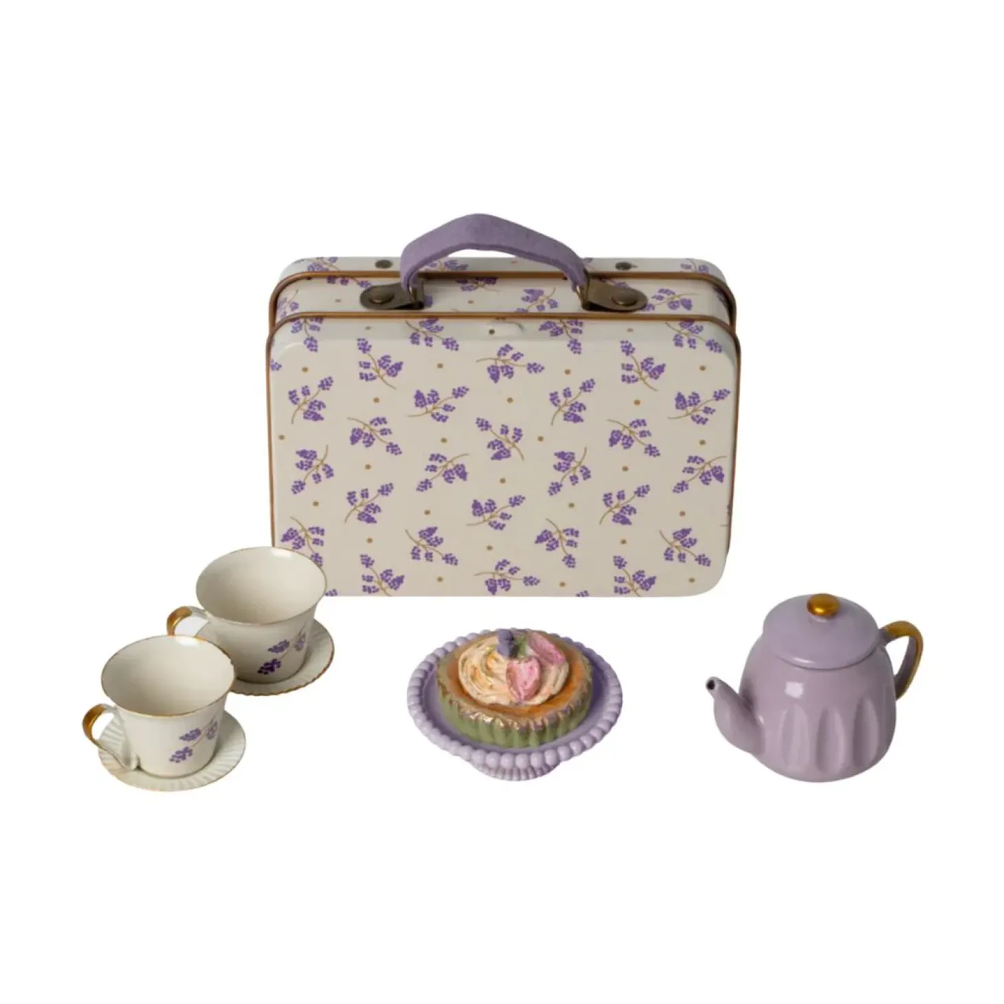 Introducing the delightful Afternoon Tea & Treat Set (Purple Madelaine) by Maileg, where every tea party becomes a magical affair. Perfectly sized for a mouse’s paw, this enchanting set invites your Maileg friends to a world of elegance and imagination. Each set comes brimming with all the essentials for a cozy tea time: charming tea cups, adorable plates, and delicious-looking cake miniatures. And the best part? It’s all beautifully packaged in a metal suitcase, lovingly decorated with Maileg’s unique hand-designed prints. This set isn’t just a toy; it’s an invitation to create heartwarming memories around the smallest, yet grandest, of tea tables.