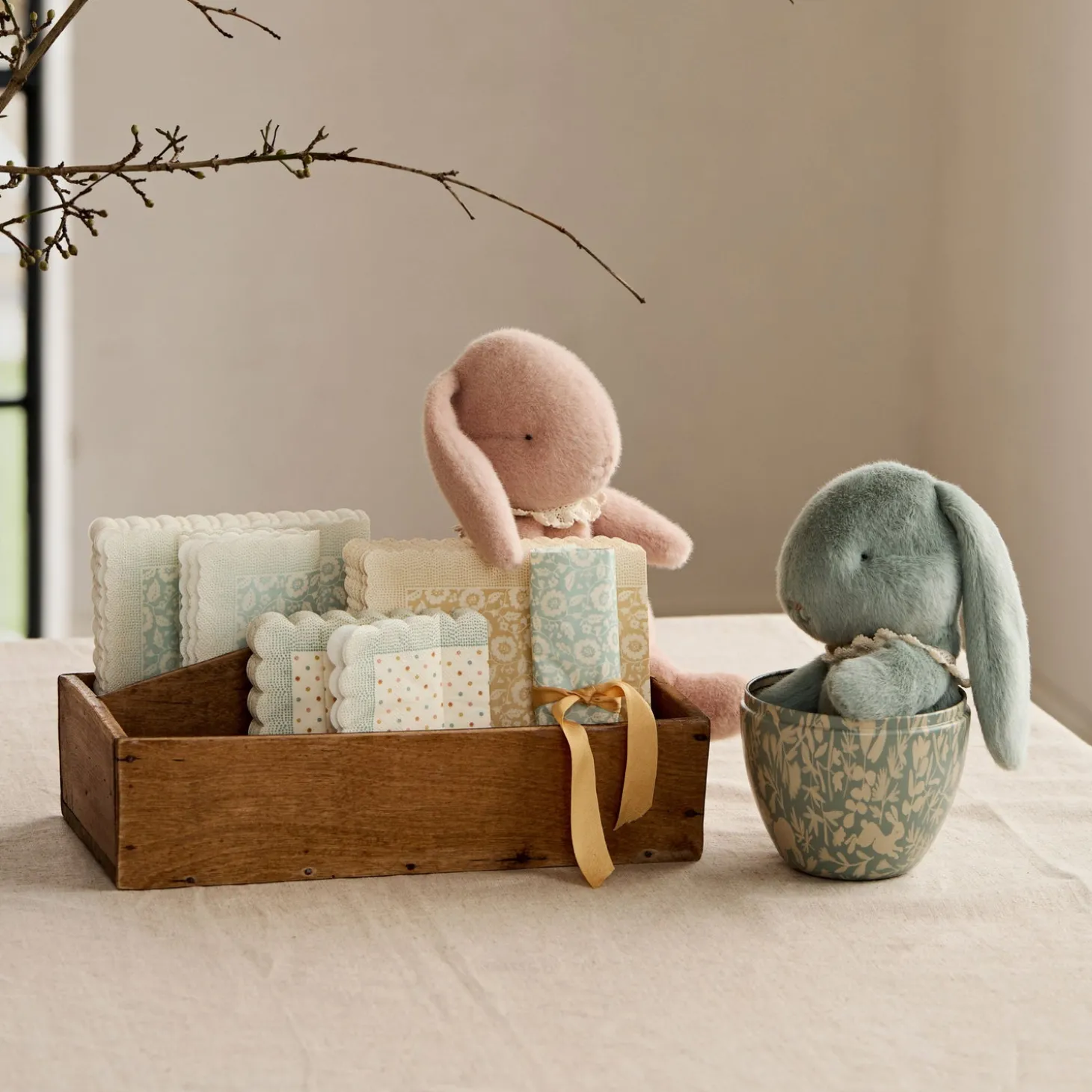 A sweet soft plush bunny with a vintage cotton collar around the neck, packed in a lovely metal egg with a beautiful print and a big soft bow on top – a perfect gift for the small ones.