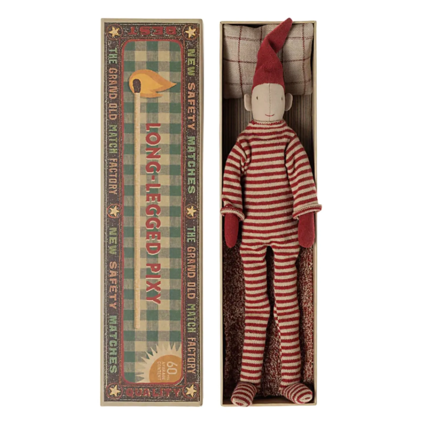 The Long-Legged Pixy comes in a beautifully decorated matchbox, complete with soft bedlinen inside. This cozy setup makes it perfect for snuggling up after a day of holiday adventures. Whether it’s hanging from the Christmas tree, perched on a shelf, or tucked into its matchbox bed, this pixy is sure to bring joy and warmth to your home.