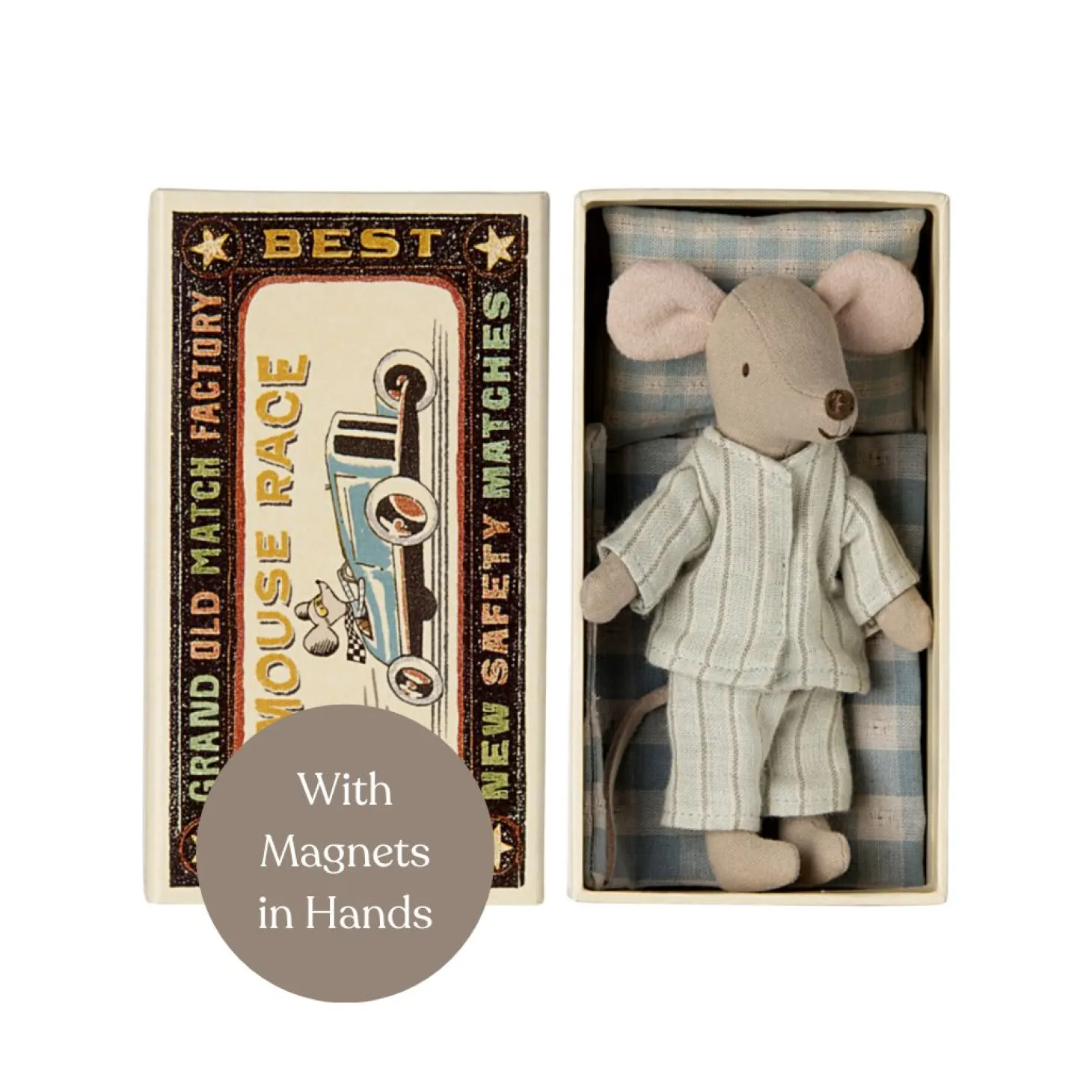 Introducing the latest treasure to grace the Maileg collection: the Big Brother Mouse in Matchbox, a 2024 edition marvel that beautifully blends classic charm with innovative features. This delightful toy, renowned for its meticulous handcrafted design and whimsical allure, now boasts added magnets in its hands, unlocking a realm of interactive play and engagement. Dressed in removable pyjamas, adorned in a serene cream and blue pattern, Big Brother Mouse is prepared for both spirited daytime escapades and peaceful nighttime slumbers in his cozy matchbox bed, complete with a soft blanket and pillow tailored for the sweetest dreams.