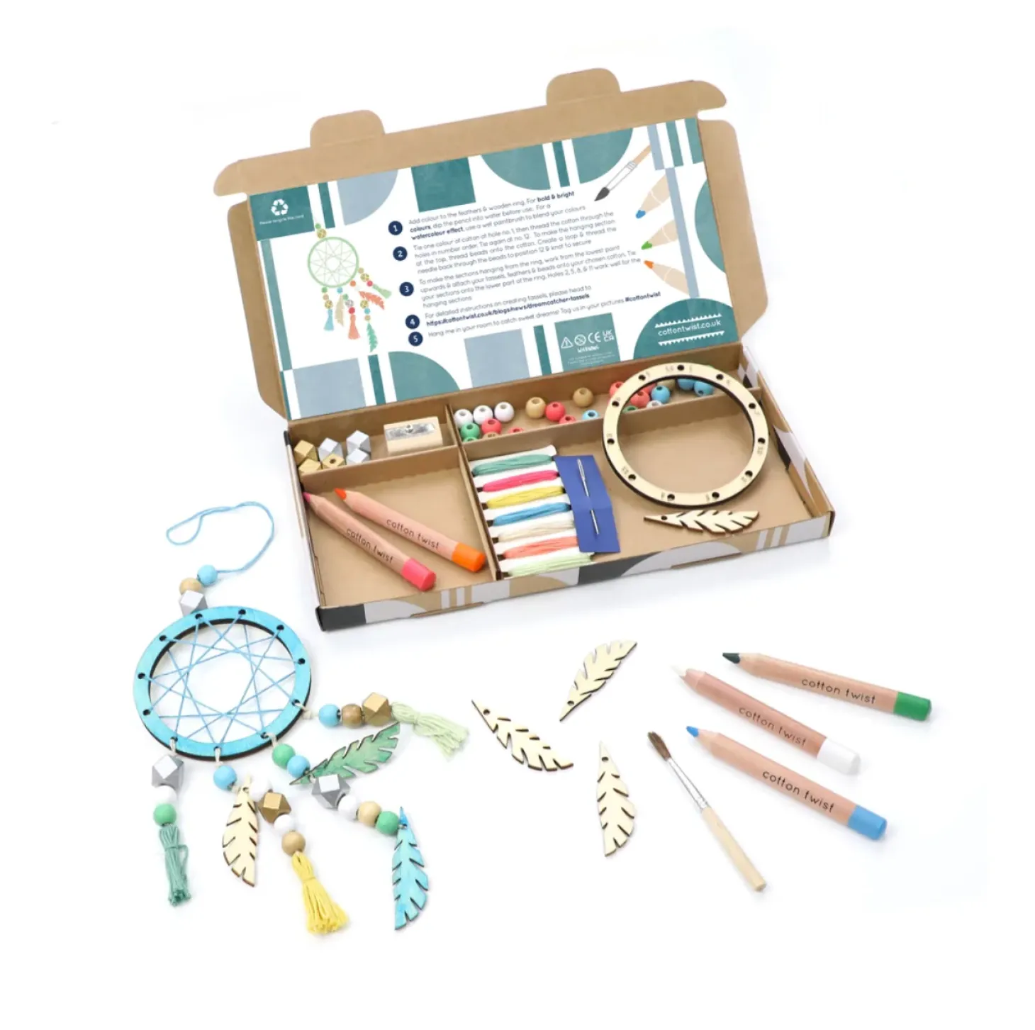 • Kit comes with: 5mm plywood ring with numbers, 3mm plywood feathers, jumbo watercolour pencils, pencil sharpener, paintbrush, cotton threads, wooden beads, needle, and instruction card