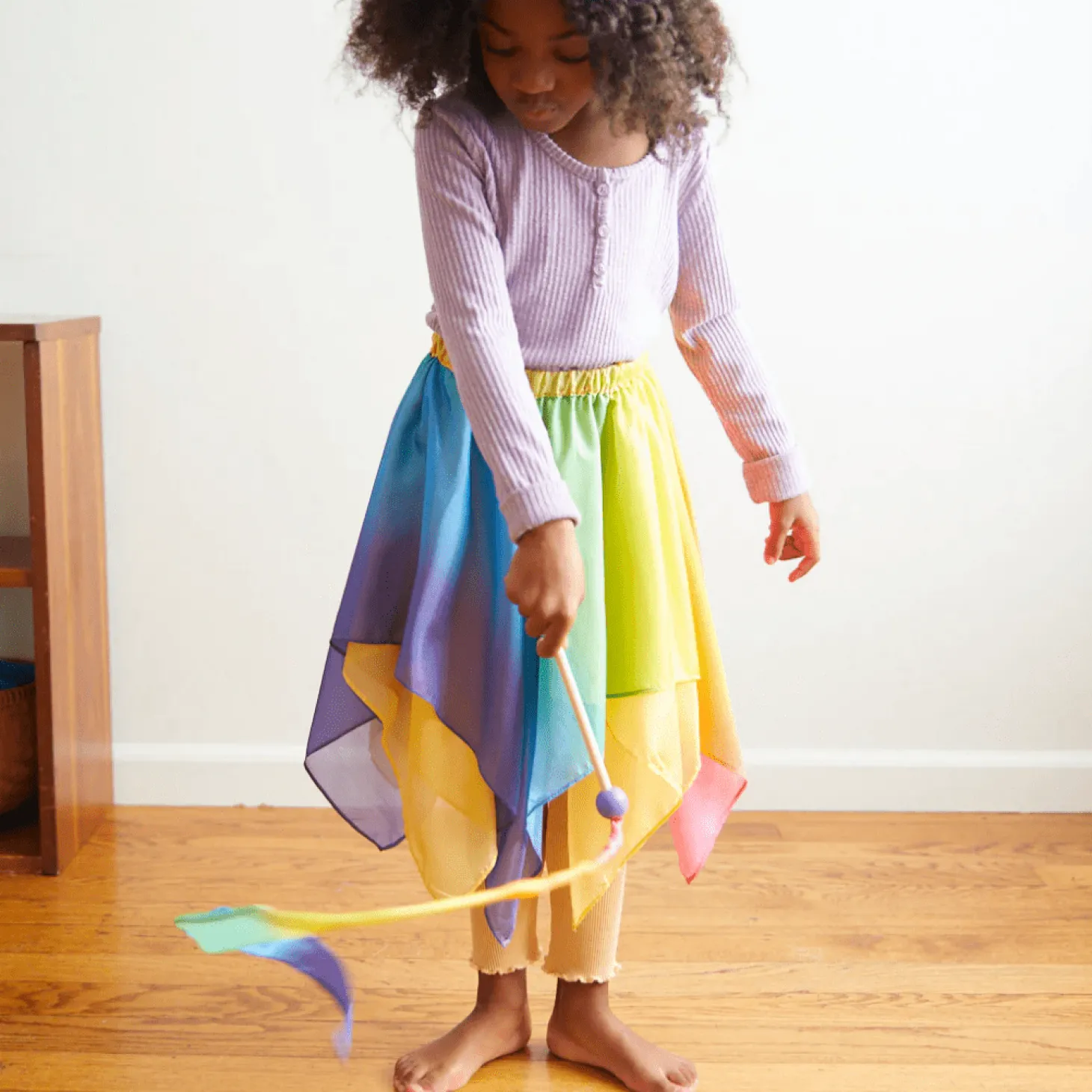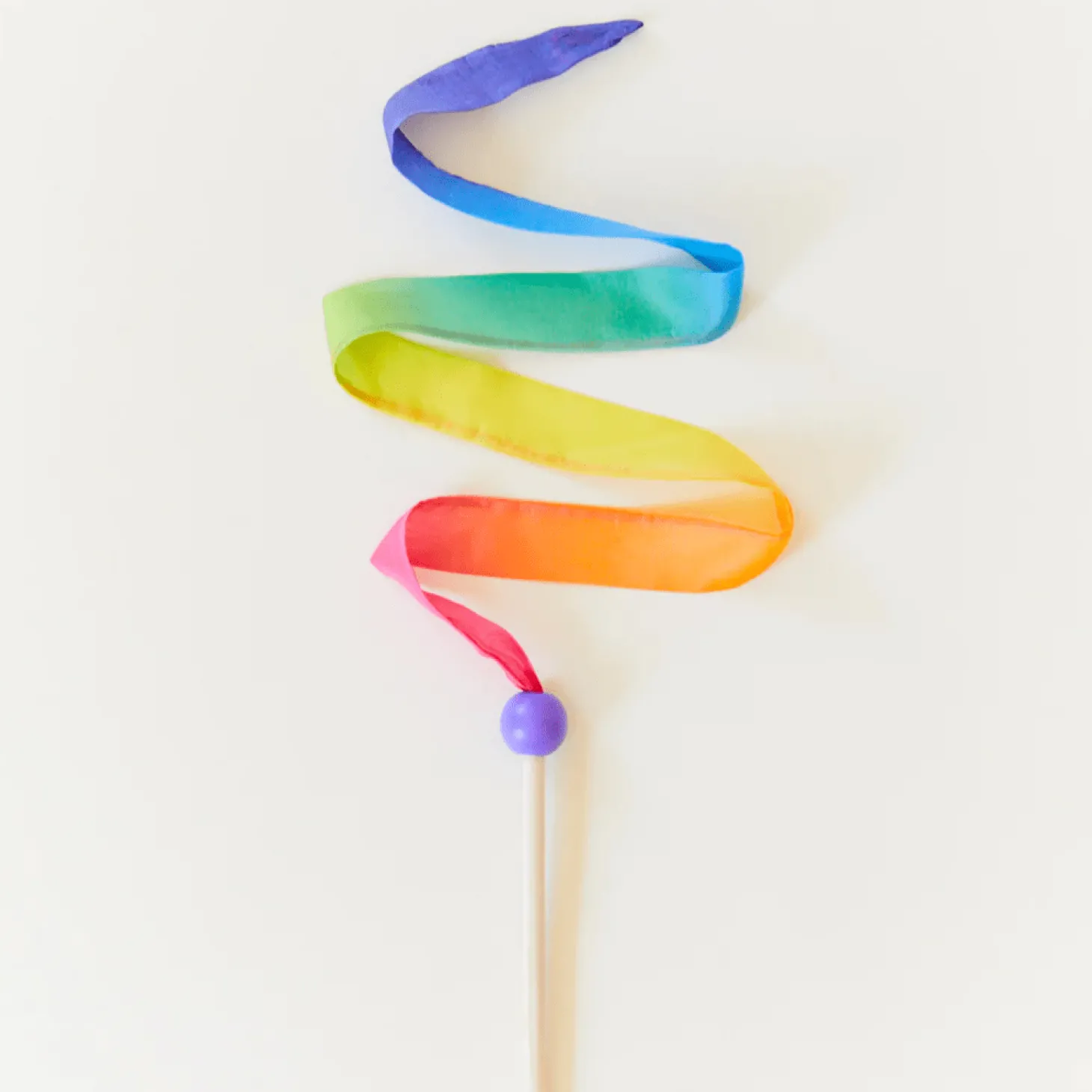 Create some magic and dance away in the wind with this beautiful mini handmade silk and wood streamer!Made from 100% mulberry silk and sustainably sourced baltic birch wood, this wooden wand with a shimmering rainbow silk streamer is sure to be a special keepsake for your little one!
