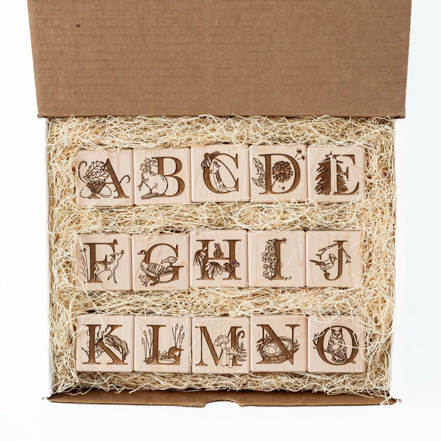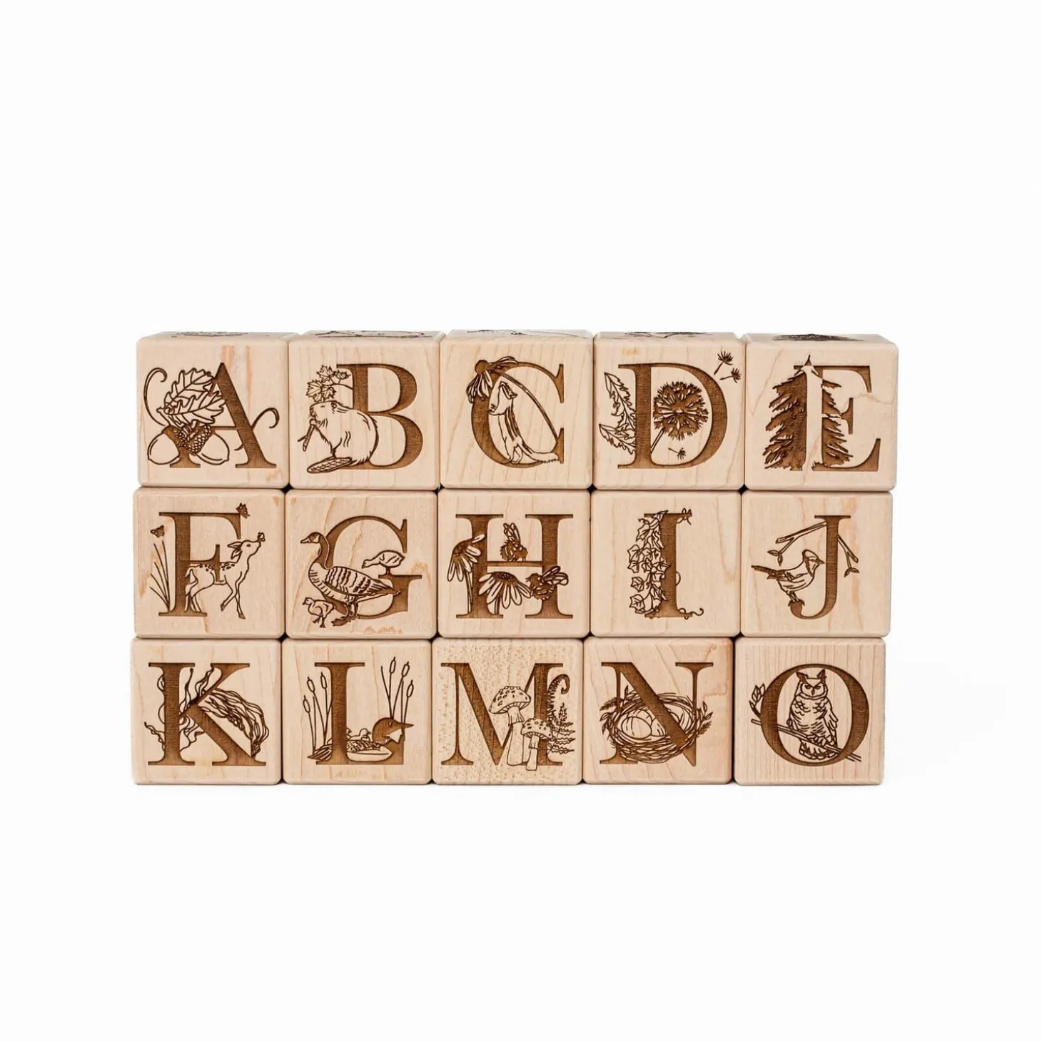 Say HELLO to our Nature Collection Alphabet Blocks – made exclusively for The Playful Peacock. Made of solid sustainably sourced Canadian Maple, all blocks are permanently engraved onall SIX sides withuppercase letters, numbers and intricate North American nature-themed graphics.