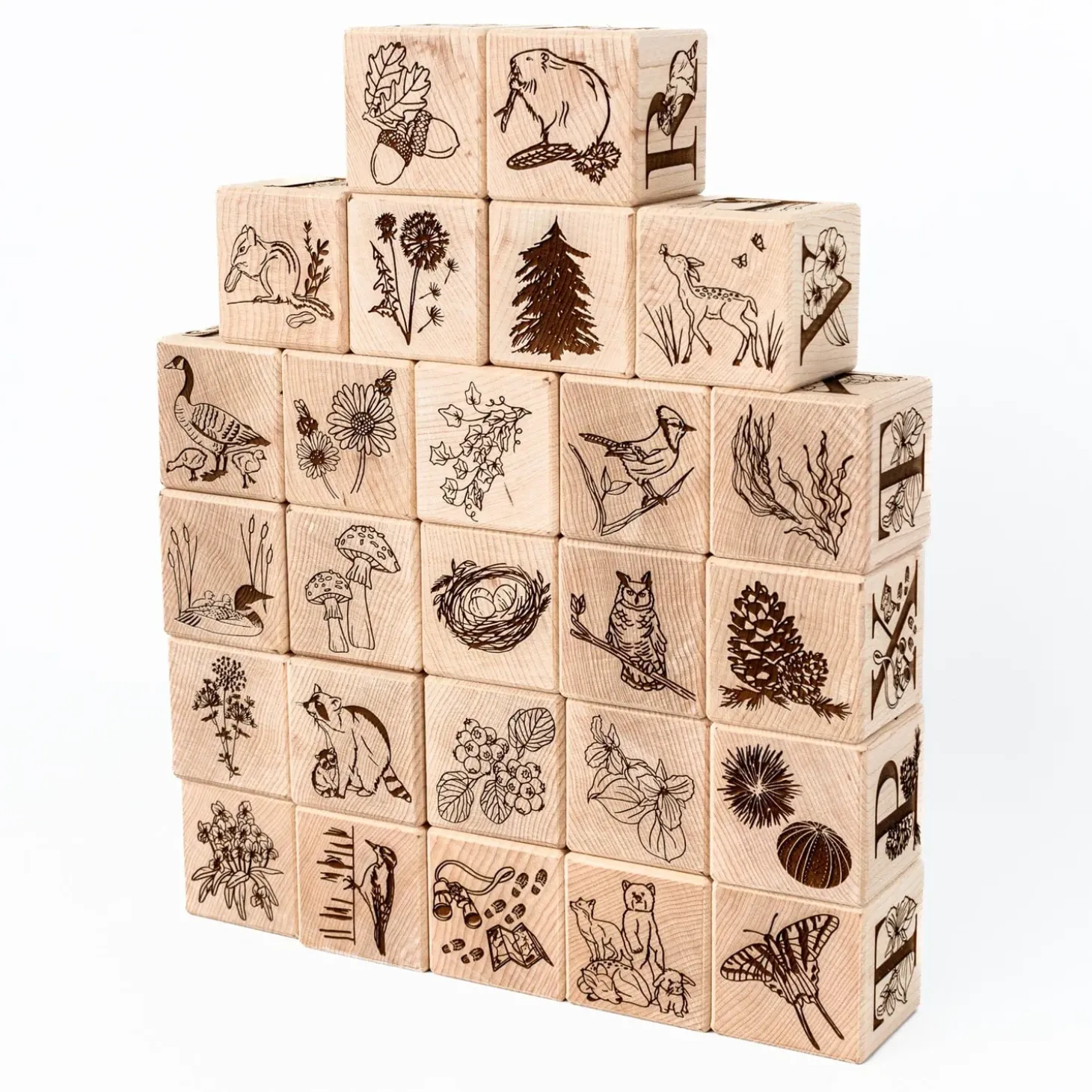 Say HELLO to our Nature Collection Alphabet Blocks – made exclusively for The Playful Peacock. Made of solid sustainably sourced Canadian Maple, all blocks are permanently engraved onall SIX sides withuppercase letters, numbers and intricate North American nature-themed graphics.