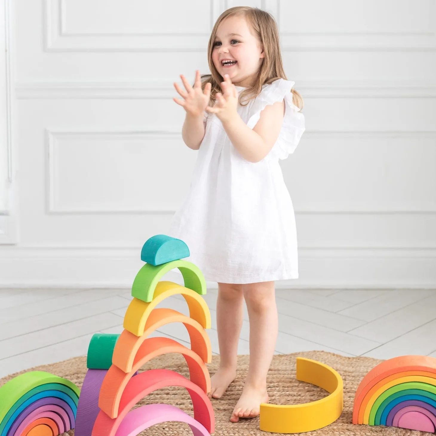 Handcrafted from FSC-Certified (sustainable) wood, and finished with natural, water-based stains and oils, this 9-piece rainbow from the Spanish brand, Ocamora is sure to light up any playroom!