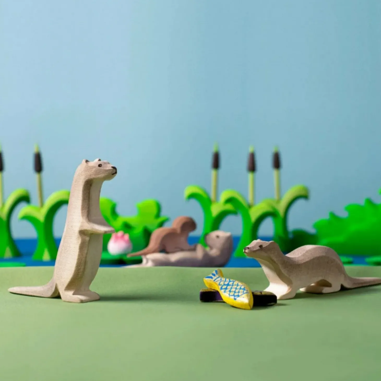 This set features a collection of wooden otters in various poses, each exuding its own character — from the carefree lounging to the watchful stance of the guardian.