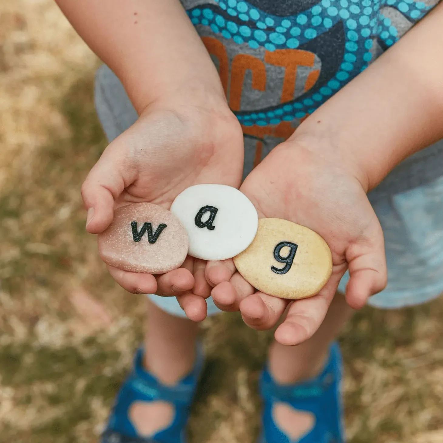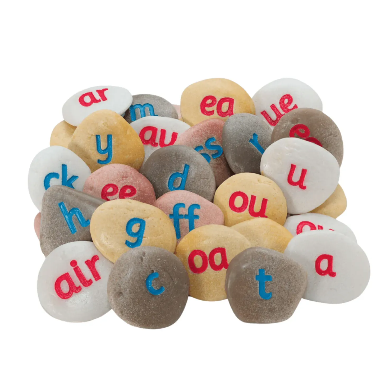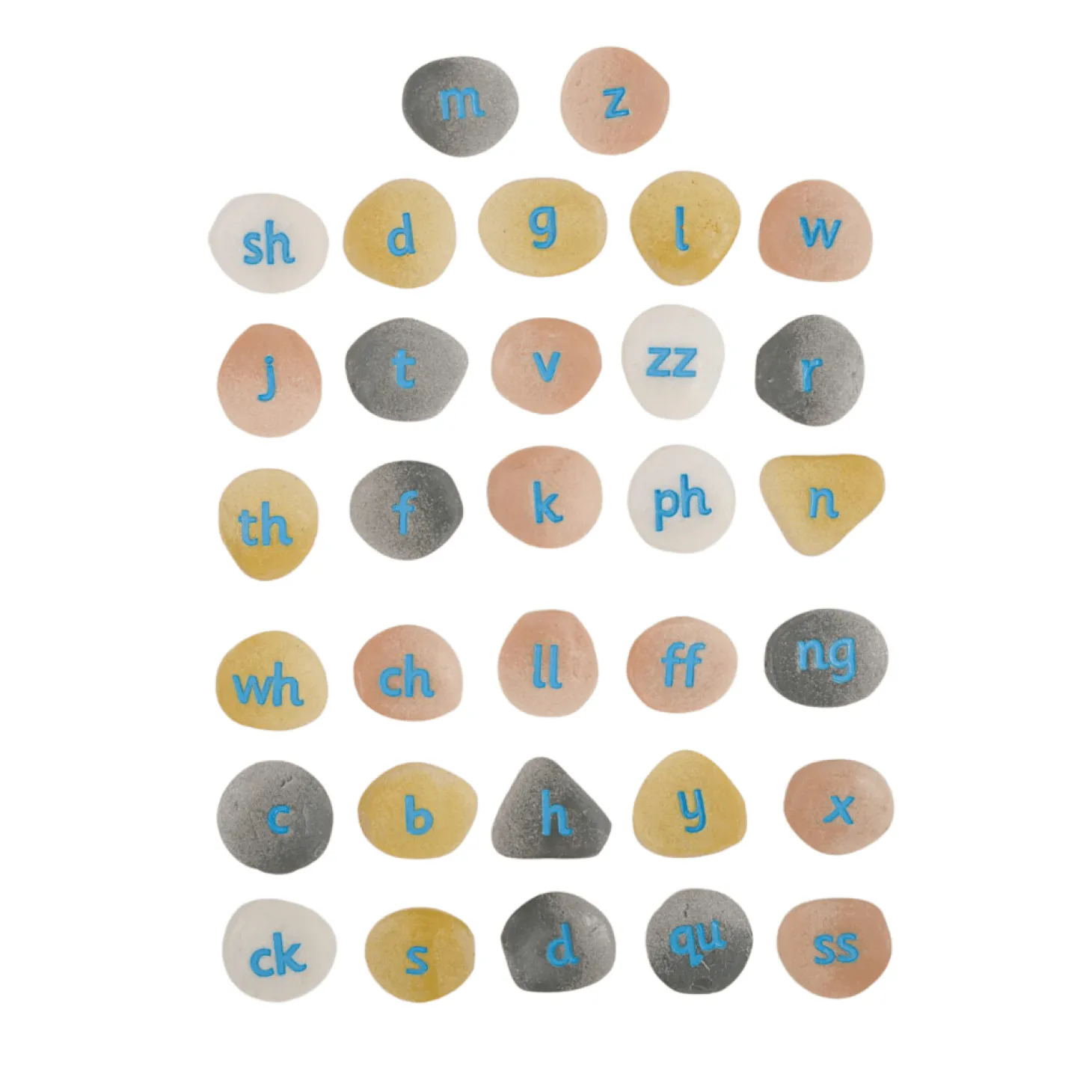 With 64 pebbles covering 44 phonemes, these pebbles are ideal for word building and early phonic work. Cast from a durable mix including real stone, they are durable, washable and ideal for use in both indoor and outdoor environments.