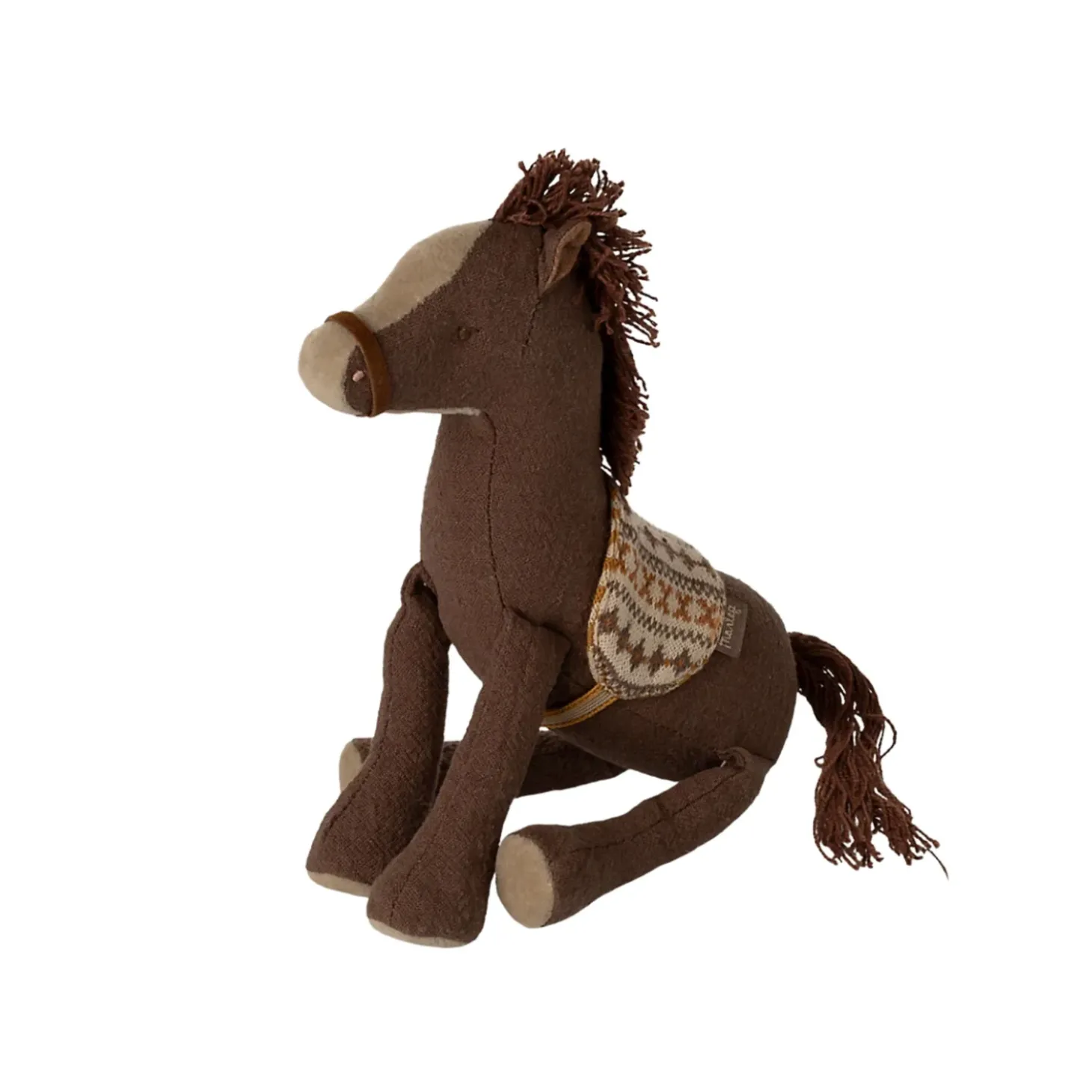 The brown pony is made in a soft cotton/linen fabric. The mane and tail is cotton strings and the saddle is made in soft knitted fabric that guarantees the ride will be comfortable.