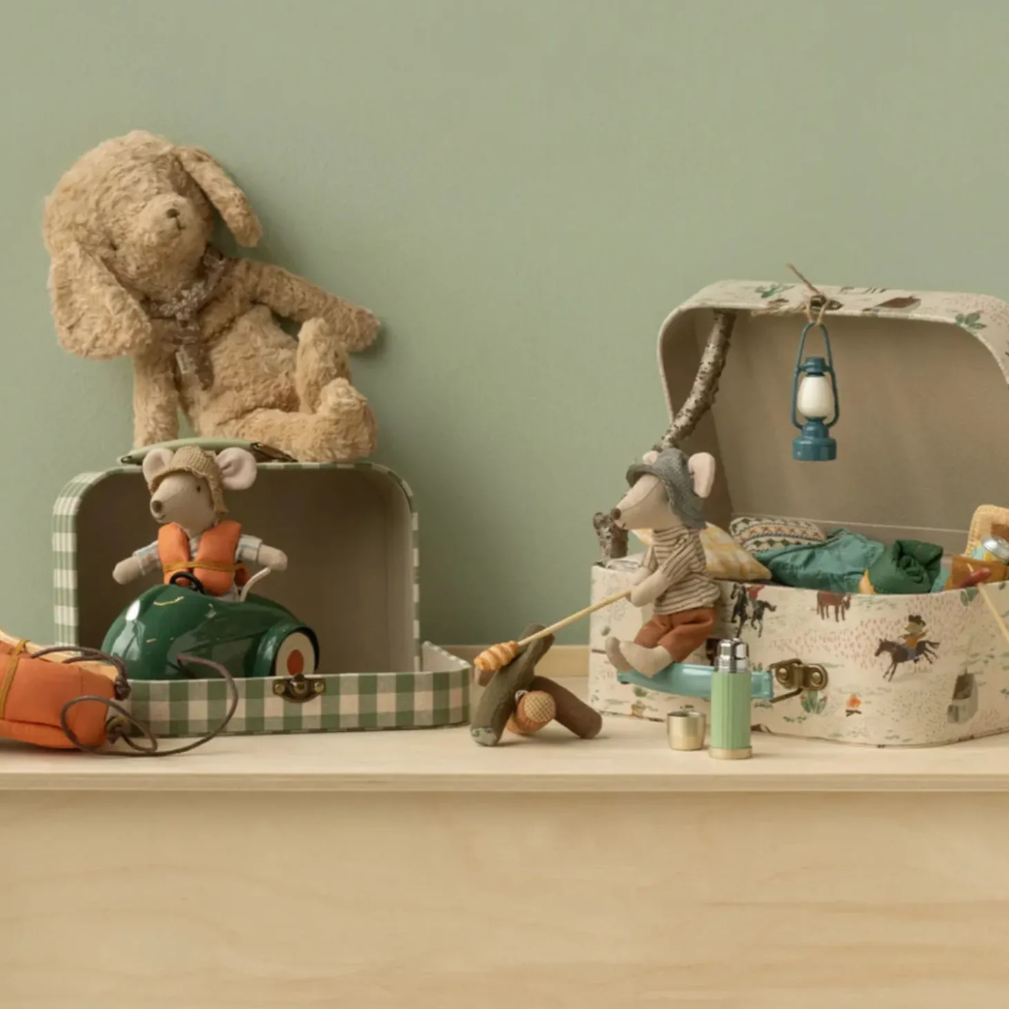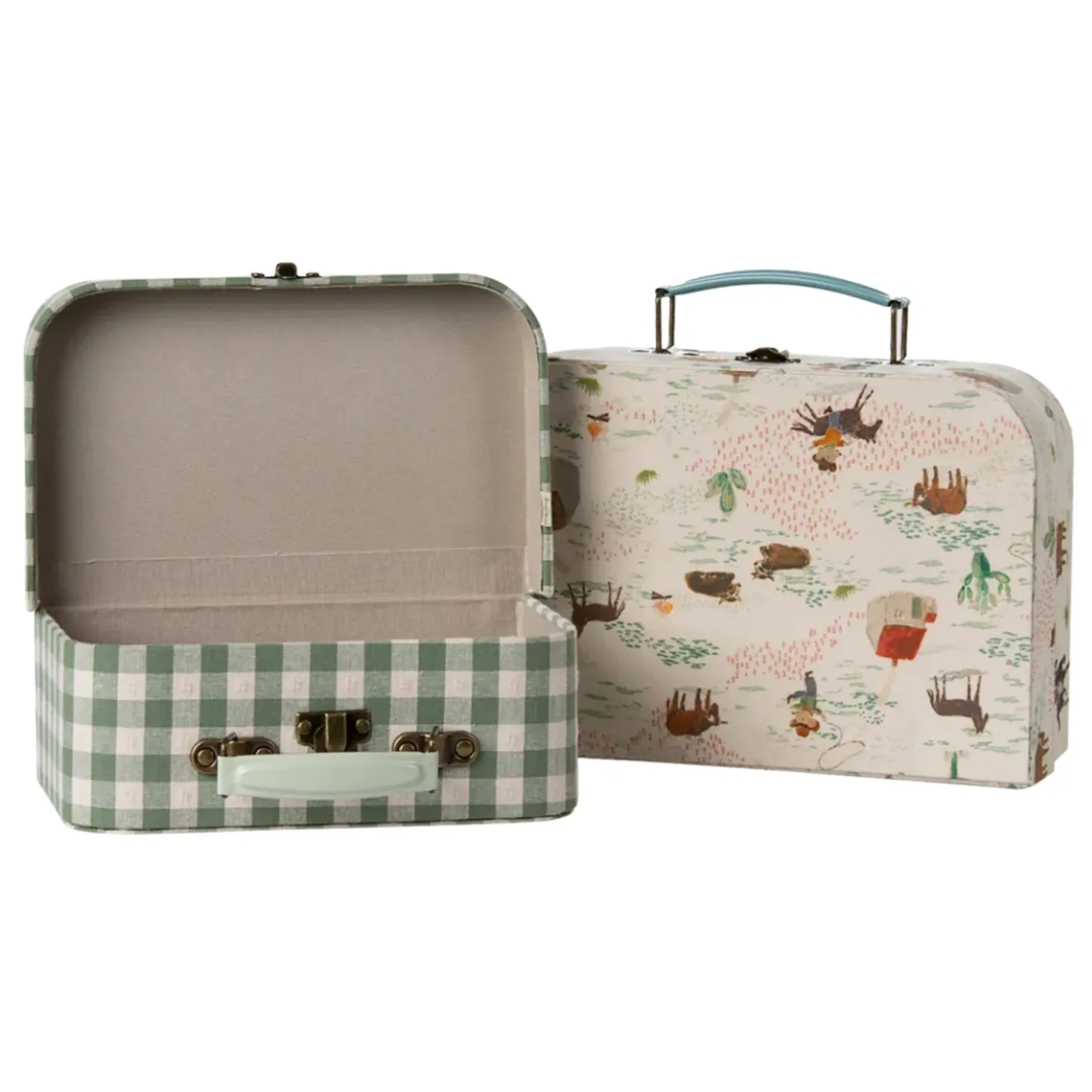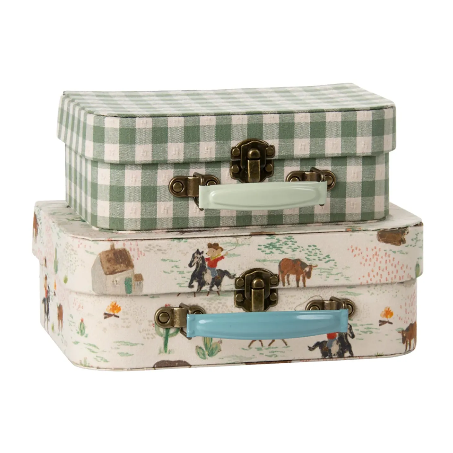 A perfect suitcase set to store all your favorite items. Each suitcase is covered by unique Maileg fabrics and has colored metal handles. This 2 pcs set is perfect for storage and for carrying your favourite toys.