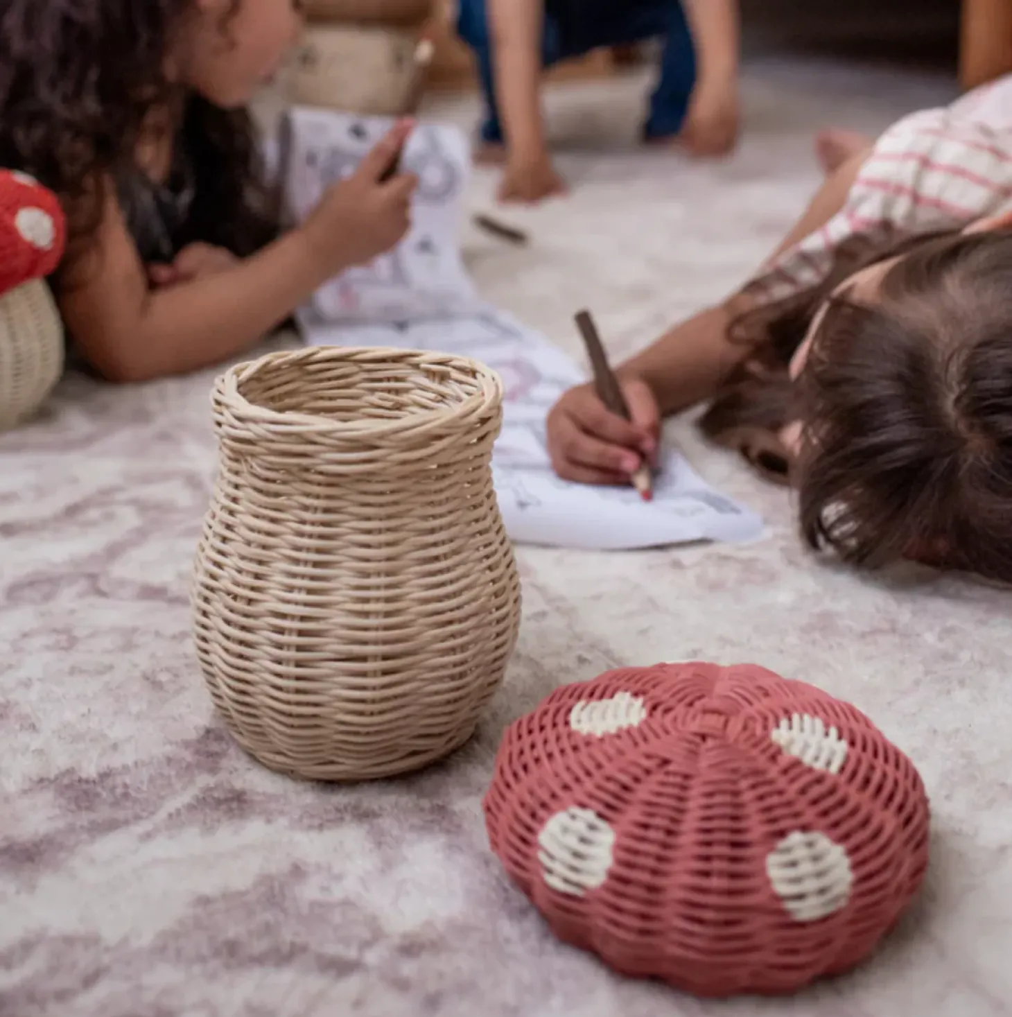 Bring a touch of woodland magic into your child’s playtime with the Olli Ella Rattan Porcini Basket in Pink Musk! Shaped like a darling mushroom, this charming basket is crafted from natural rattan and comes with six hand-carved wooden Twig Pencils in vibrant colours. The cap lifts off to reveal the perfect spot for toy storage or keeping those pencils safe and sound. Whether it’s used to store teeny treasures or serve as an imaginative cup and bowl, the Porcini Basket is a wonderful, multi-use addition to any playroom.