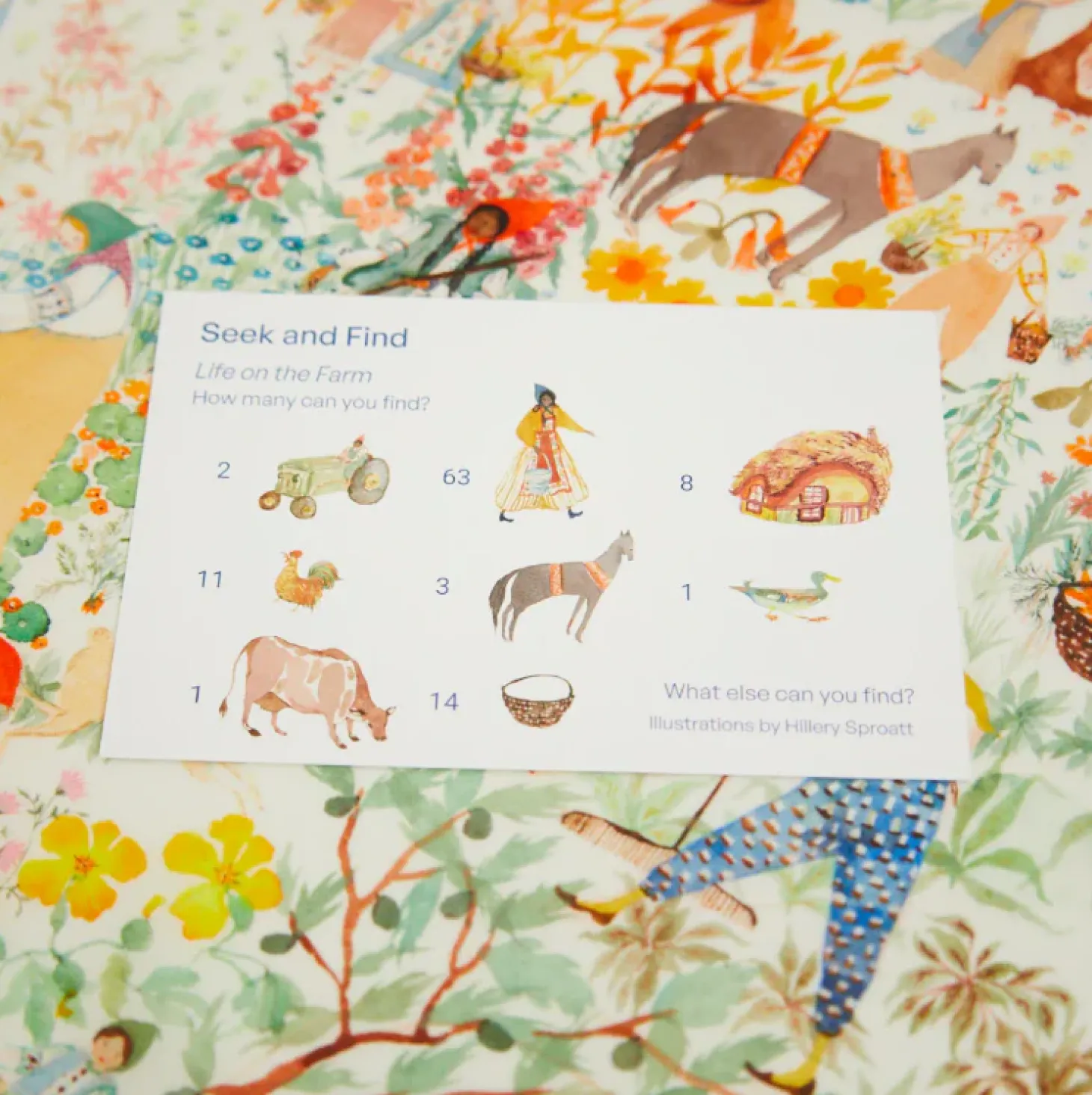 The Farm Seek & Find features artwork by Hillery Sproatt. Find her at @hillerysproatt on Instagram.