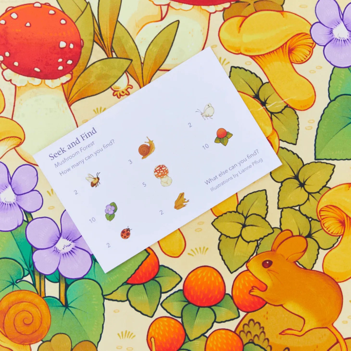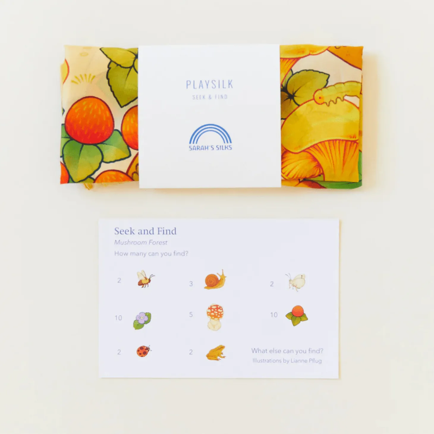 Seek & Find Playsilks are made in collaboration with different artists. The Mushroom Seek & Find features artwork by Lianne Pflug, you can find her on Instagram @loonpflug.