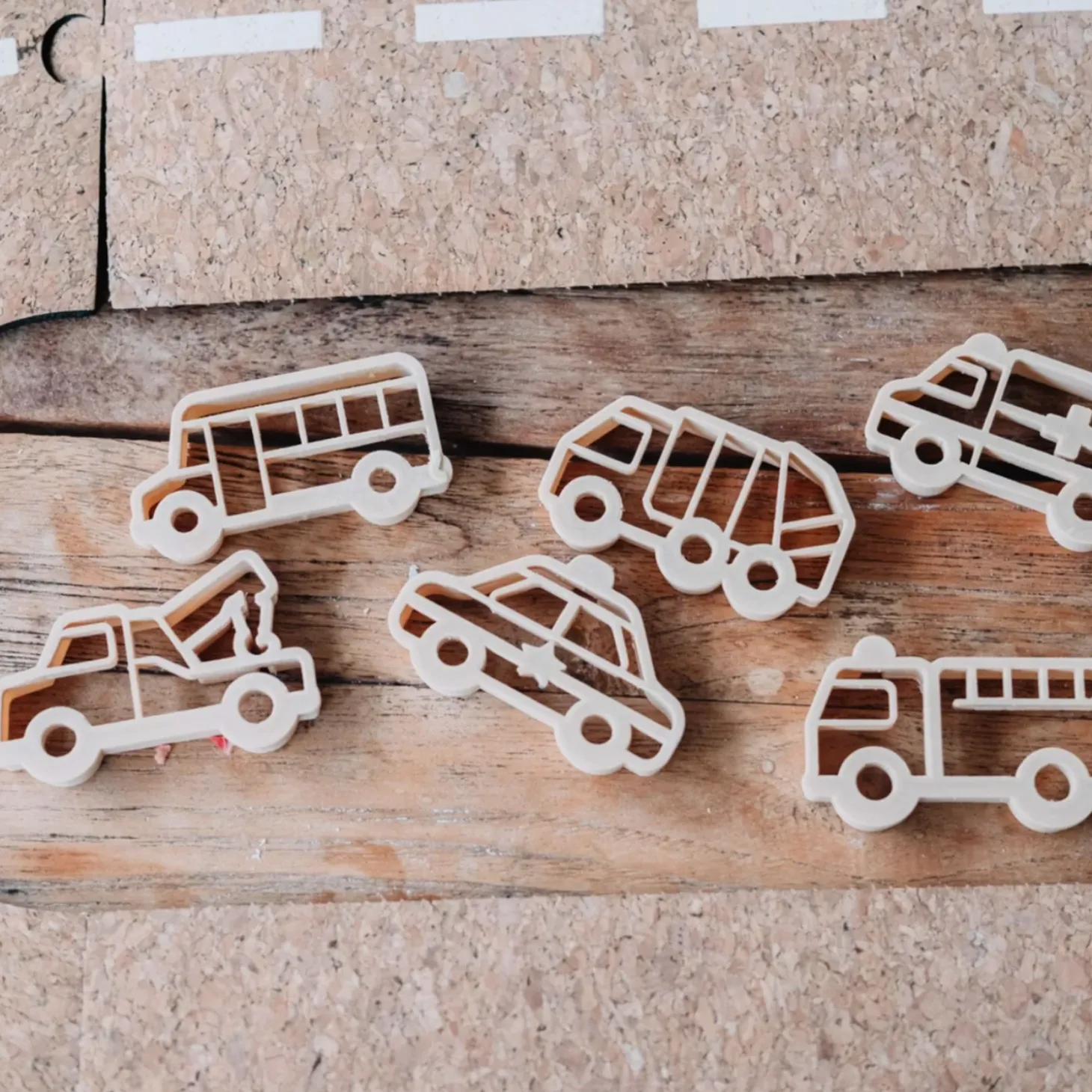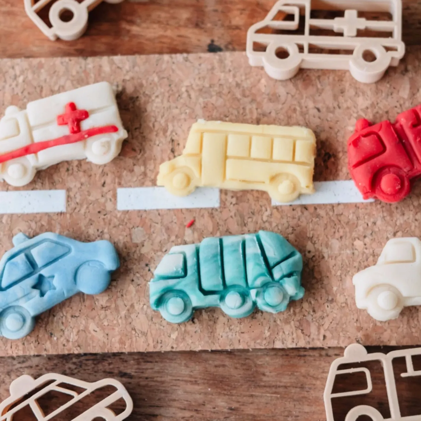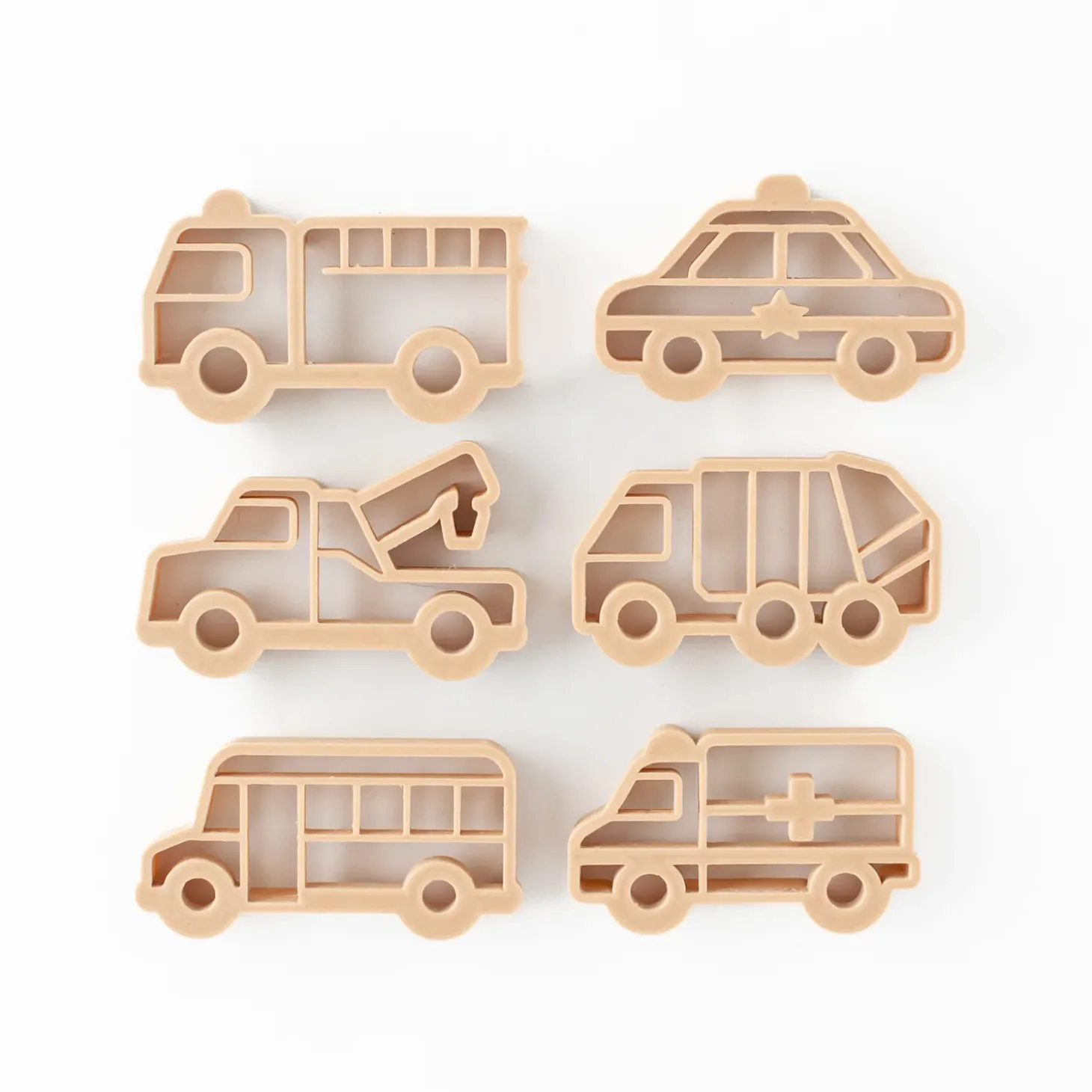 • Set includes 6 Eco-Cutters: 1x Firetruck, 1x Police car, 1x Ambulance, 1x Tow truck, 1x School bus, 1x Garbage truck
