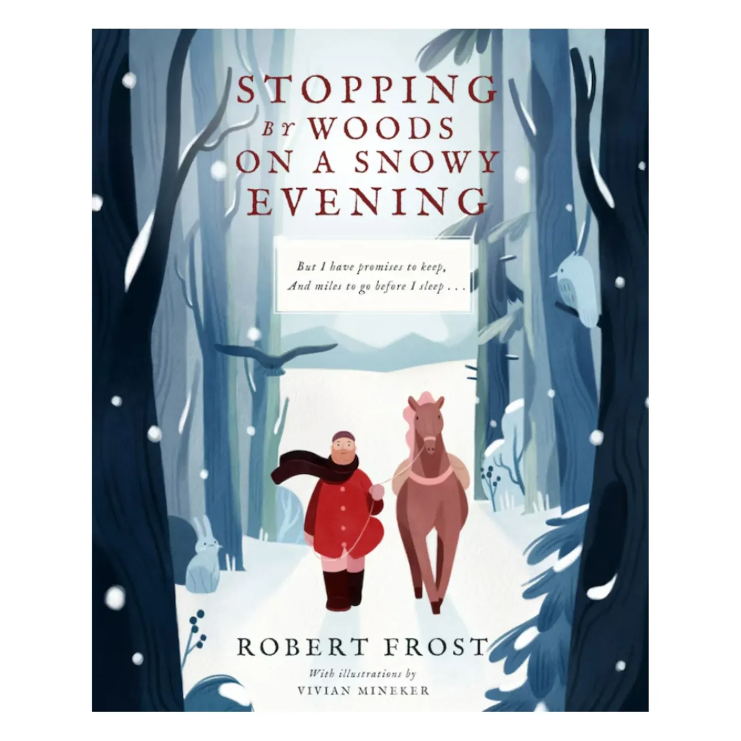 In this exquisite picture book, Robert Frost’s beloved poem is paired with Vivian Mineker’s stunning illustrations, creating a magical winter landscape that will captivate readers of all ages. Follow the gentle journey of a traveler who pauses to appreciate the tranquil beauty of the snowy woods, even as he remembers the promises he must keep and the miles he has yet to go.