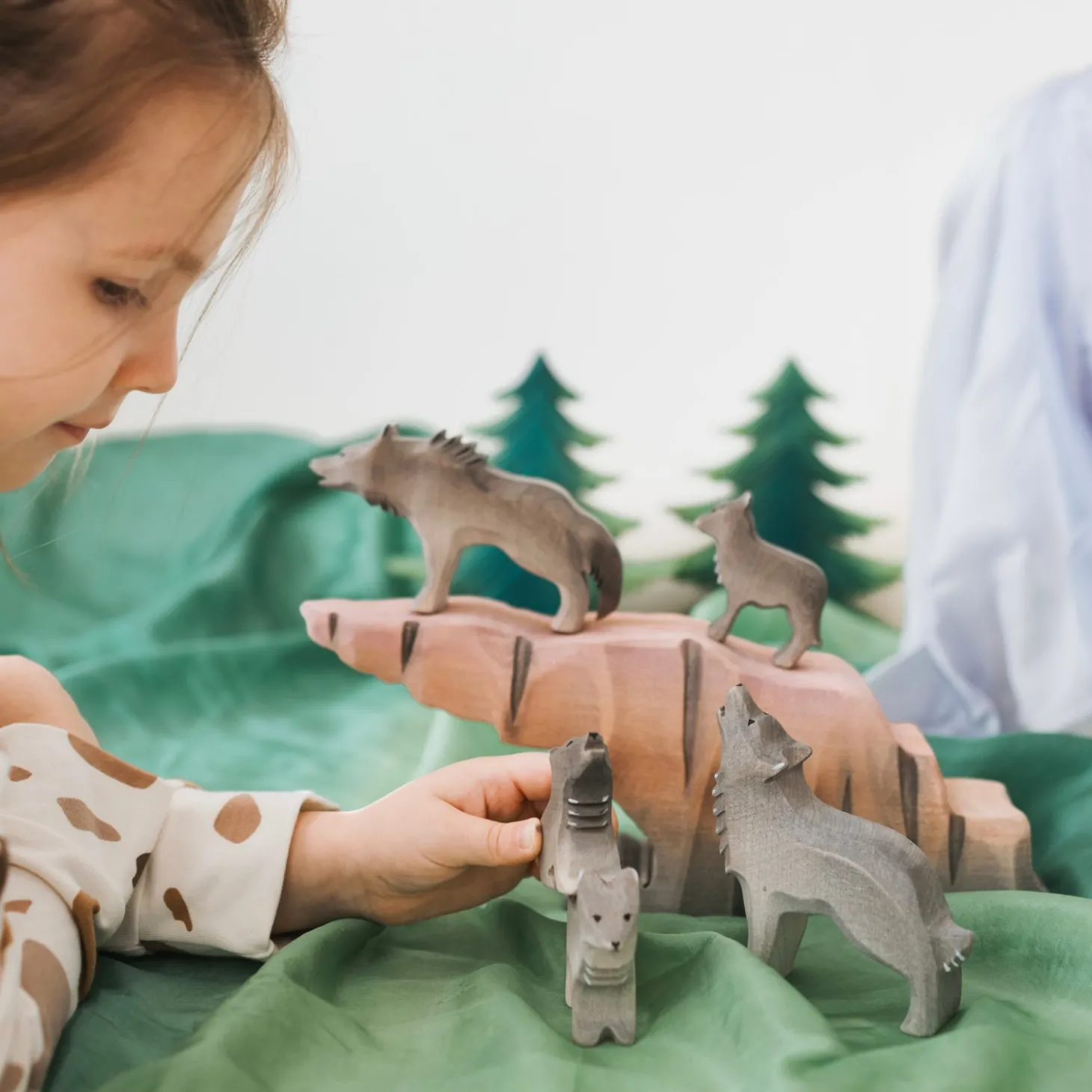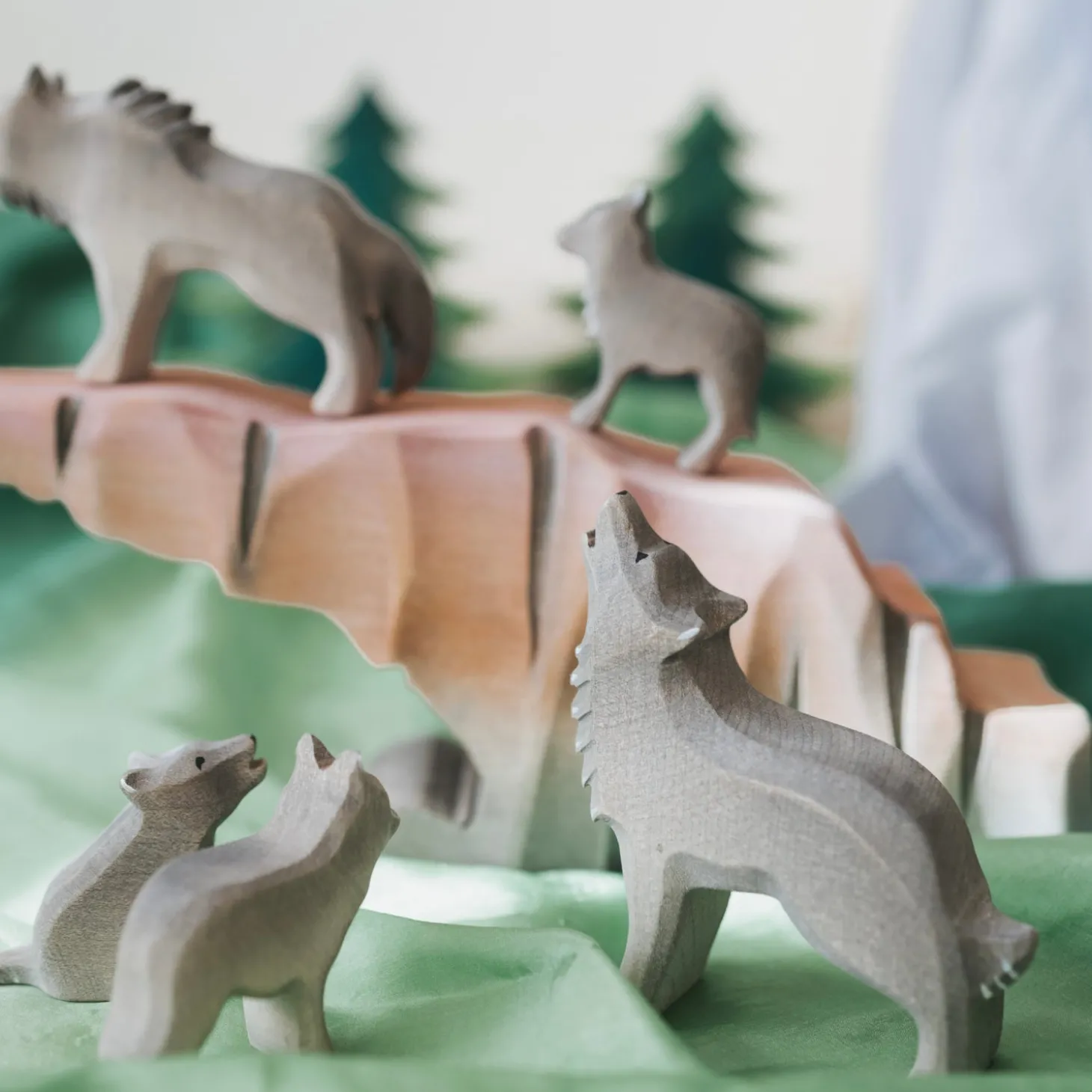 Ideal for both educational play and storytelling, this Wolves Set invites children to explore the fascinating world of wildlife, fostering a deep appreciation for nature and the importance of conservation. The varied poses and sizes of the wolves offer a glimpse into the life of a wolf pack, blending realism with the magic of imagination to create a captivating play experience. This set is not just a tool for creative play; it also serves as a stunning decorative element that brings a touch of the wild into any setting. Perfectly complementing the Bumbu Toys Howlstone, it allows for an immersive small world play setup that transports young minds to the heart of the wilderness.