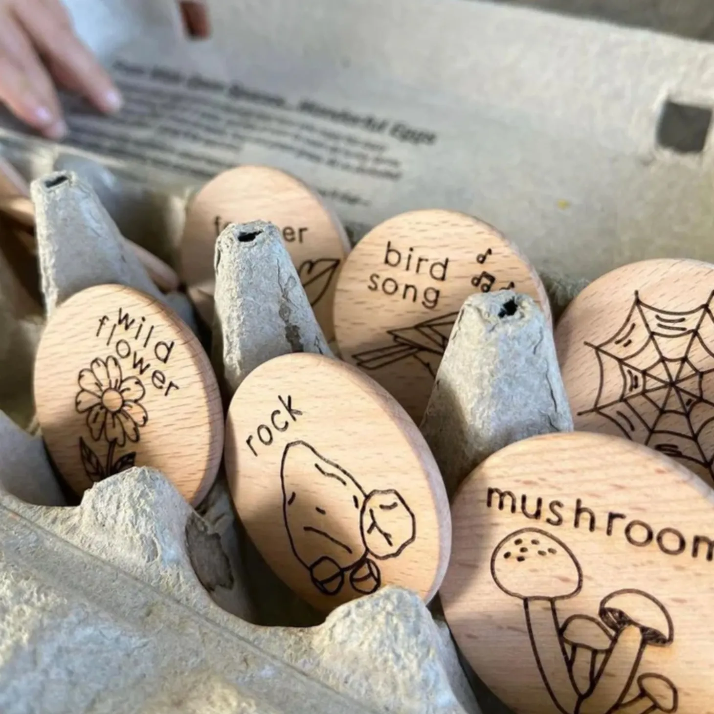 • Each set includes twenty-four 2″ hardwood discs that have been laser engraved with 24 different items to search for in the forest.