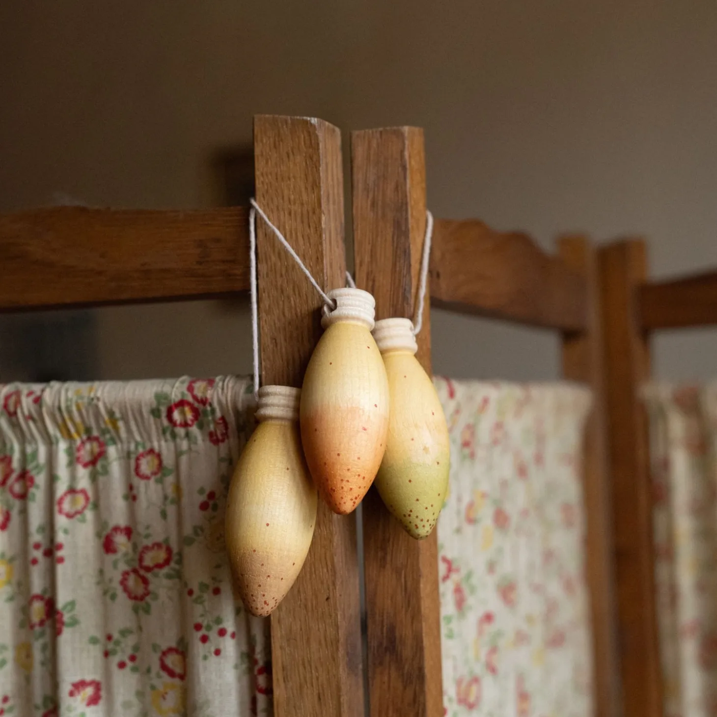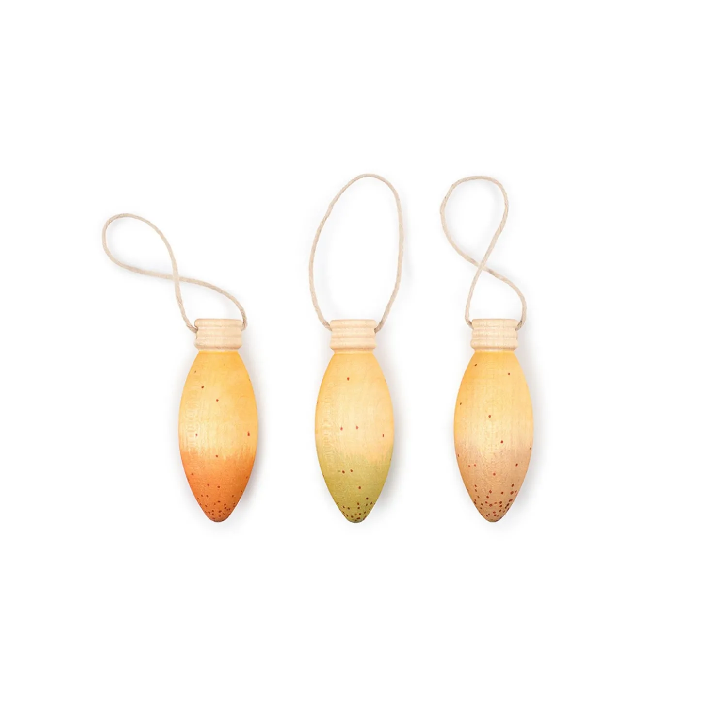 • 3 lamp-shaped pieces, all painted by hand. Includes thread for hanging.