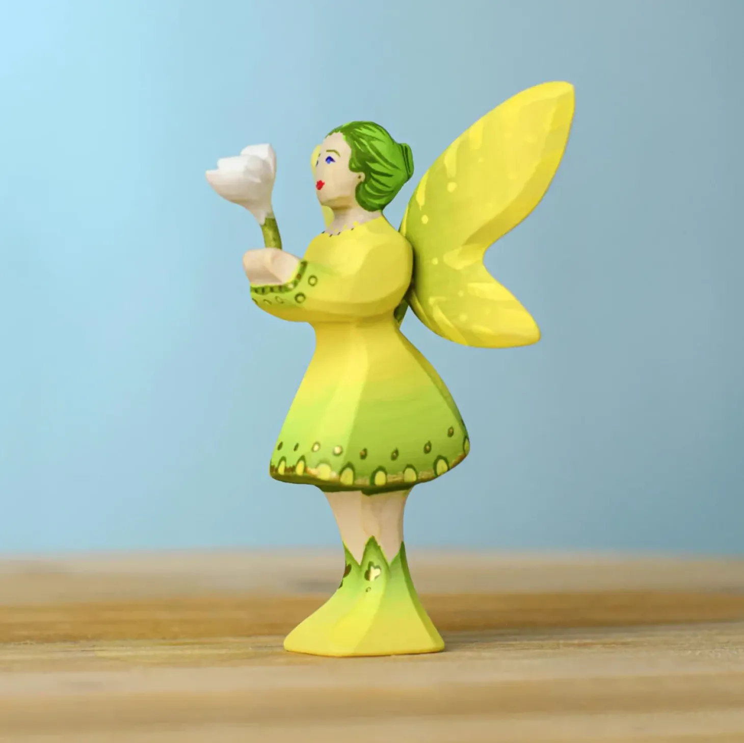 Embark on a mystical journey with Bumbu Toys’ Woodland Fairy, a handcrafted masterpiece designed to kindle the imagination of those who believe in the magic of the forest. Adorned in a golden gown, with wings that shimmer like the morning dew, this fairy exudes the grace and beauty of nature’s own. Holding a space where a blooming flower might rest (sold separately), she invites a world of imaginative play and storytelling. This figurine is not merely a toy but a piece of art, meticulously brought to life by the skilled artisans of Bumbu Toys, a brand celebrated for its commitment to quality and tradition in wooden toy craftsmanship.